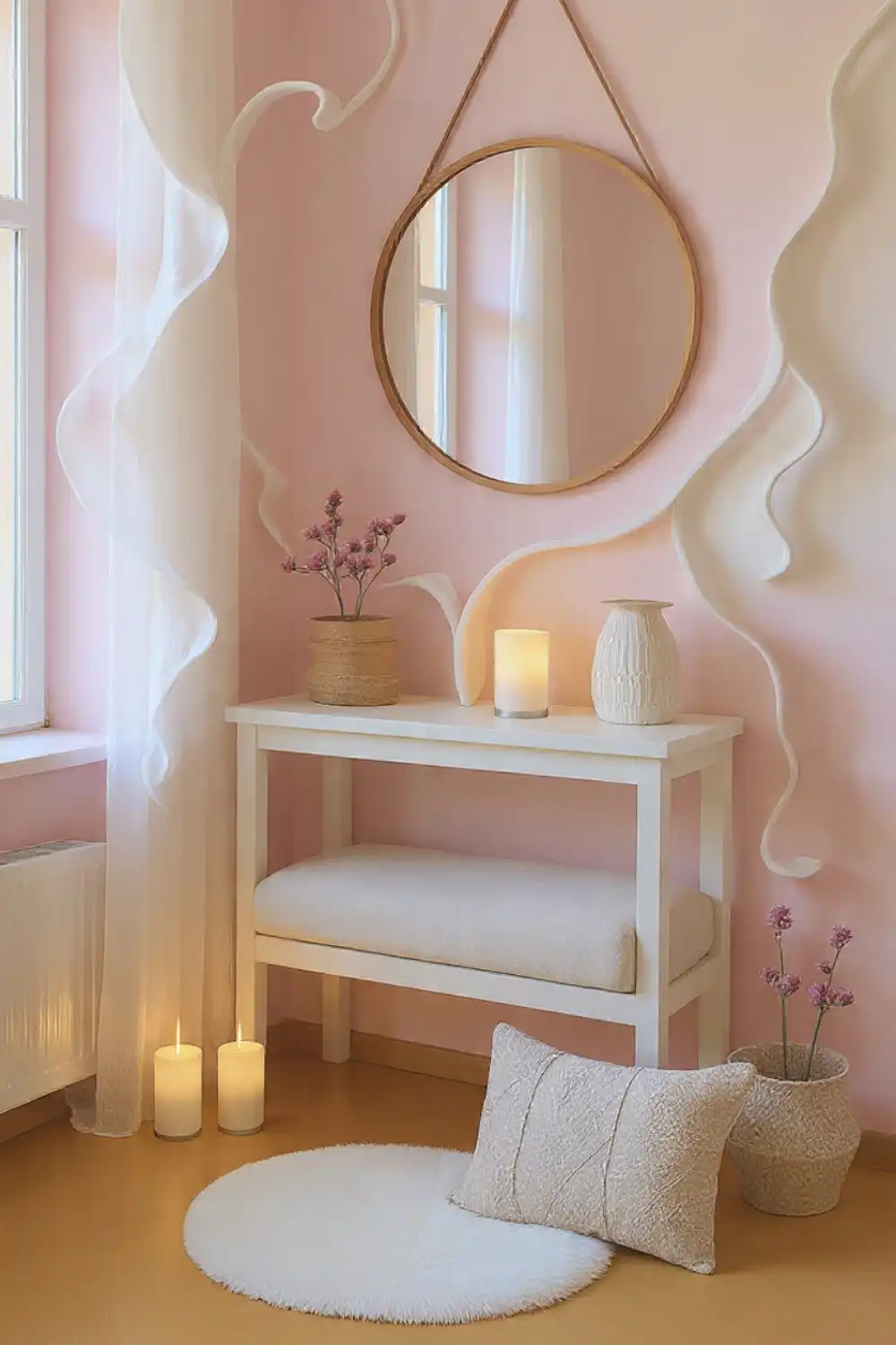 Wave-shaped objects have become a signature of the whimsical aesthetic. Add wavy mirrors, scalloped lampshades, curvy shelves, or rippled table edges. The flowing shapes soften your room and create a fun, youthful vibe without looking childish. Choose pastel or neutral tones to keep the look refined. A large wavy mirror can also make your apartment feel bigger by reflecting light and creating movement. In 2026, scalloped patterns are especially popular in bathroom and bedroom decor. Even one wavy object instantly adds aesthetic charm that stands out beautifully in Pinterest posts and videos.