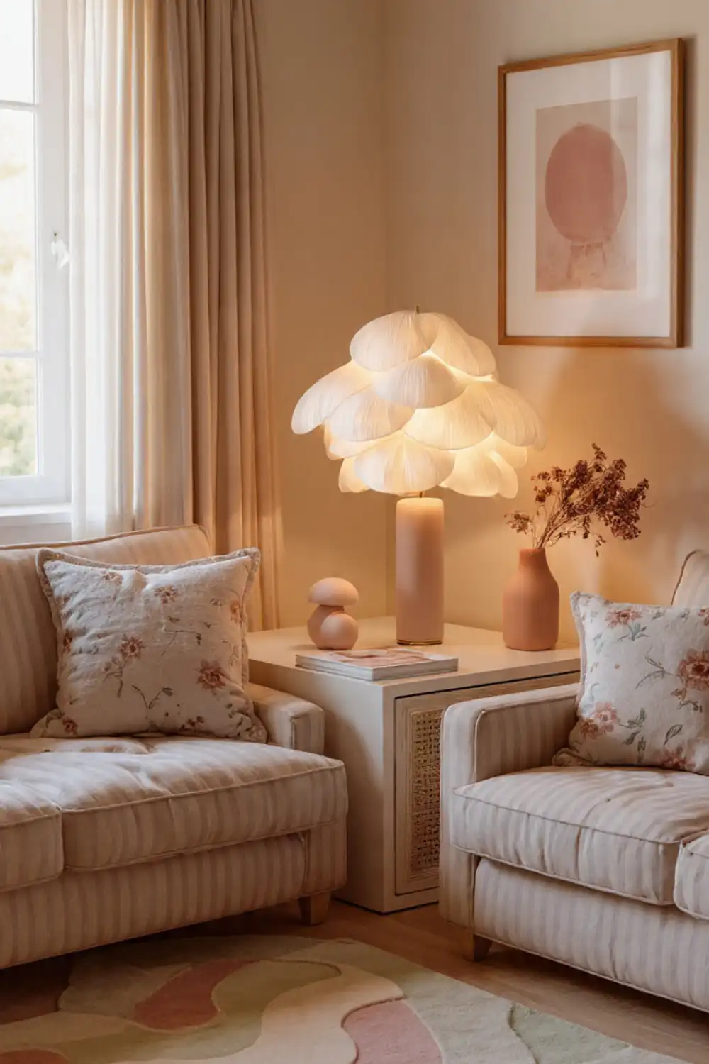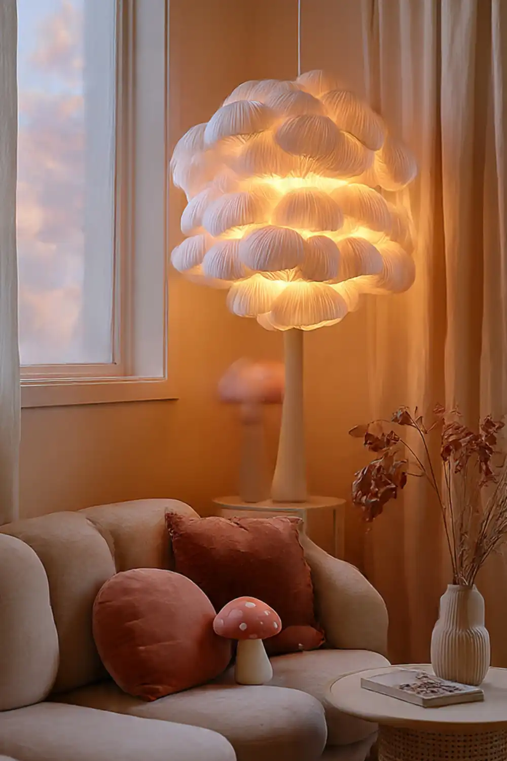 Statement lighting instantly elevates a whimsical apartment. Choose sculptural lamps, mushroom lamps, cloud-shaped pendants, or lantern-style lights. Artistic lighting turns functional pieces into decor. Place them where they can shine—on side tables, shelves, or near seating areas. The softness of these organic shapes adds charm and encourages visual curiosity. In 2026, Pinterest trends show rising interest in “aesthetic lamps,” especially mushroom lamps and pleated shades. These lights provide both cozy ambiance and playful style, making them a perfect match for whimsical interiors.