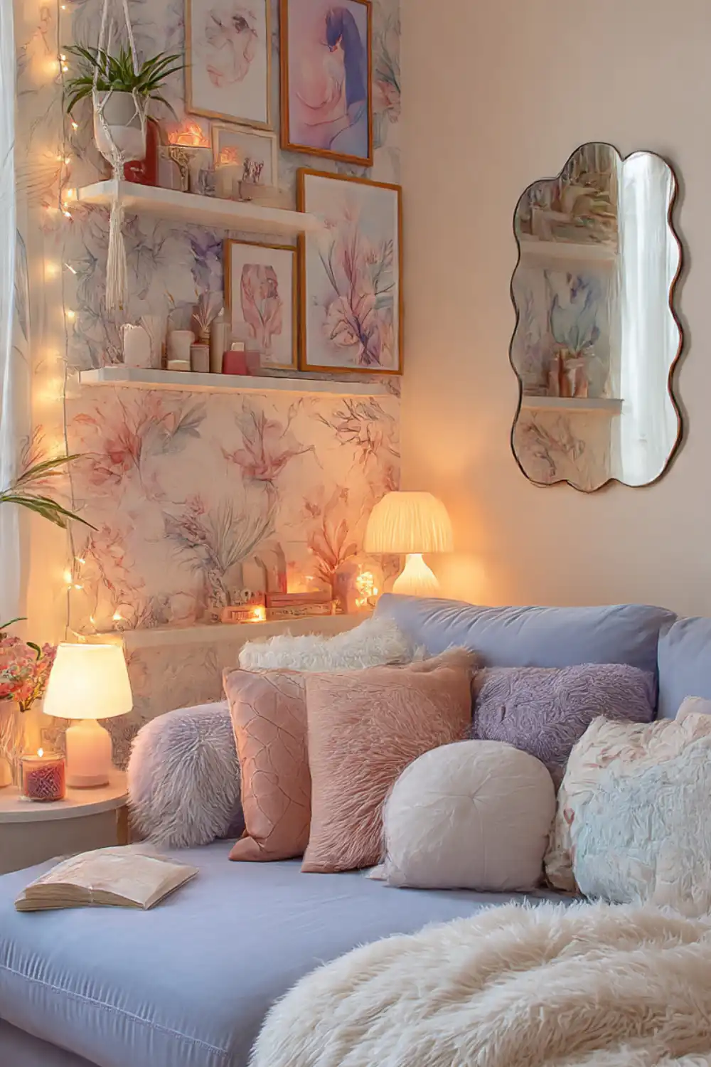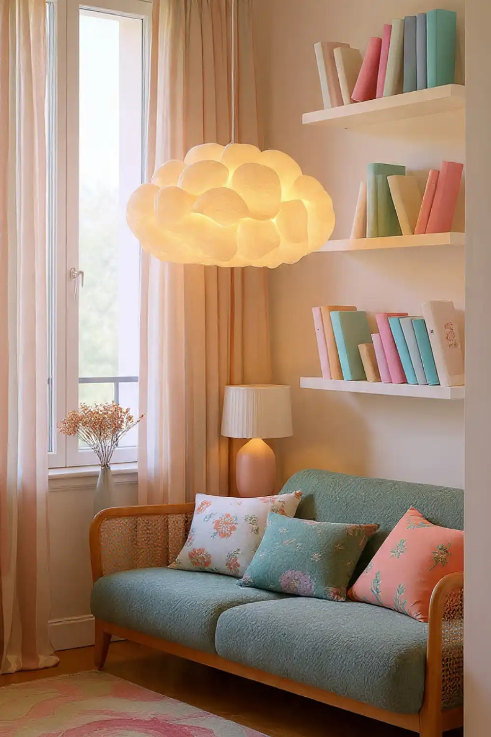 Warm, layered lighting is essential for achieving an inviting whimsical feel. Replace harsh overhead lights with soft table lamps, floor lamps, fairy lights, LED candles, and backlit shelves. Choose warm (not yellow) tones around 2700–3000K for a cozy glow. Light different corners to create visual interest and eliminate dark shadows. Lamps with pleated shades or frosted glass add extra softness. Lighting transforms mood instantly—especially in small apartments where natural light is limited. In 2026, layered lighting is among the top-requested decor elements on Pinterest because it makes even the simplest room feel luxurious, gentle, and welcoming.