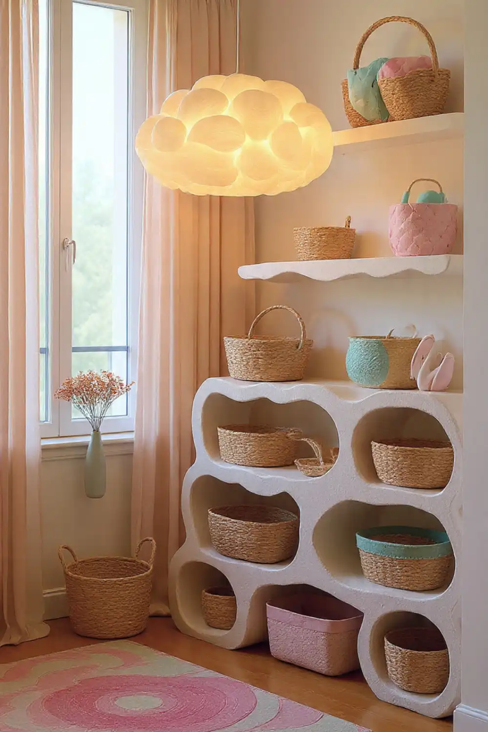 Whimsical storage combines beauty with function. Choose woven baskets, scalloped bins, under-bed pastel storage, or rounded-edge shelves. Storage doesn’t need to look stiff or boxy—opt for organic silhouettes that blend visually into your decor. In tiny apartments, stylish storage is essential for maintaining a clean aesthetic. In 2026, Pinterest users are searching for “beautiful storage ideas,” especially for small spaces. Organic storage helps keep your apartment clutter-free while making every corner feel soft, gentle, and inviting.
