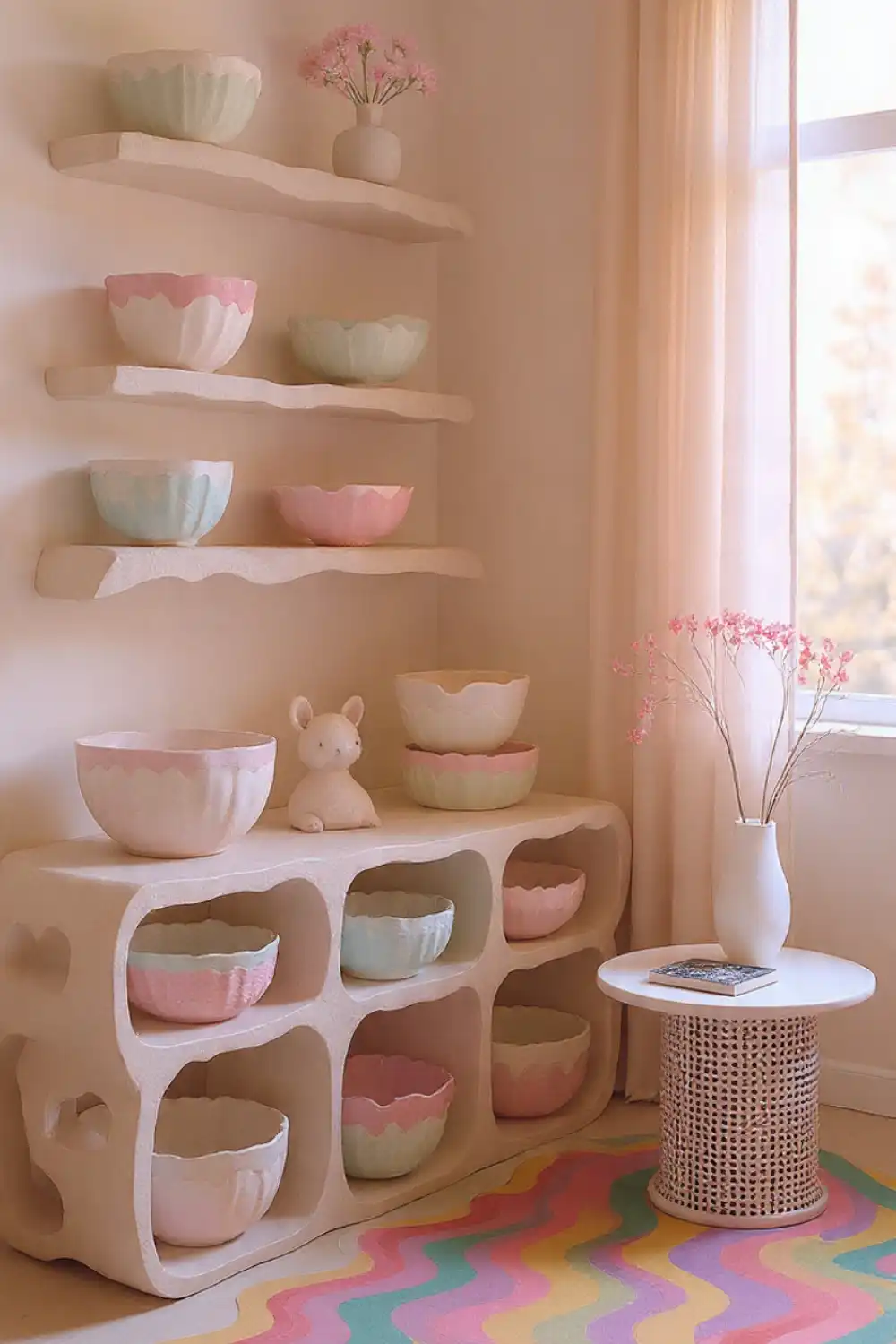 Your dishes can be part of the whimsical aesthetic. Choose pastel plates, wavy-edged bowls, handmade mugs, or floral-patterned ceramics. Display them openly on shelves or kitchen rails. Cute tableware adds charm to your space even when you’re not cooking. In 2026, aesthetic kitchen styling remains popular on Pinterest as people personalize their homes. Whimsical tableware brings joy to everyday routines and turns functional items into aesthetic accents.