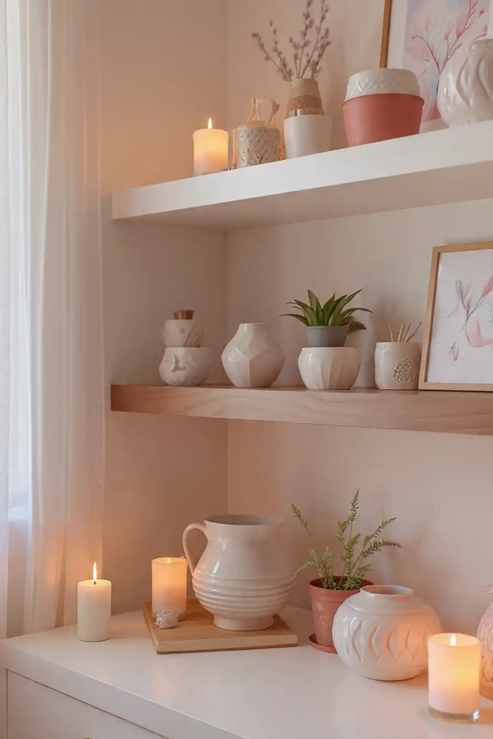 Floating shelves are perfect for displaying art, plants, ceramics, and books without consuming floor space. Choose wavy edges, pastel tones, or vintage wood for a whimsical touch. Arrange items with varied heights and textures to create visual balance. Floating shelves also create vertical interest—important in tiny apartments where floor space is limited. In 2026, “vertical décor” is trending on Pinterest as small living becomes more common. Floating shelves let you curate delightfully aesthetic displays while keeping your apartment practical and uncluttered.