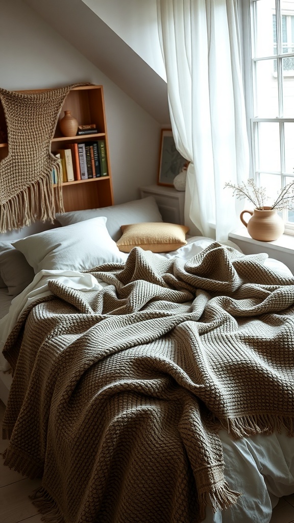 In the image, you see a beautifully arranged bed with a chunky knit blanket casually draped over the top. The neutral tones create a serene vibe, making it easy to relax. Adding layers with different textures, like a soft white sheet beneath, enhances that cozy feeling. Don’t shy away from mixing and matching fabrics!