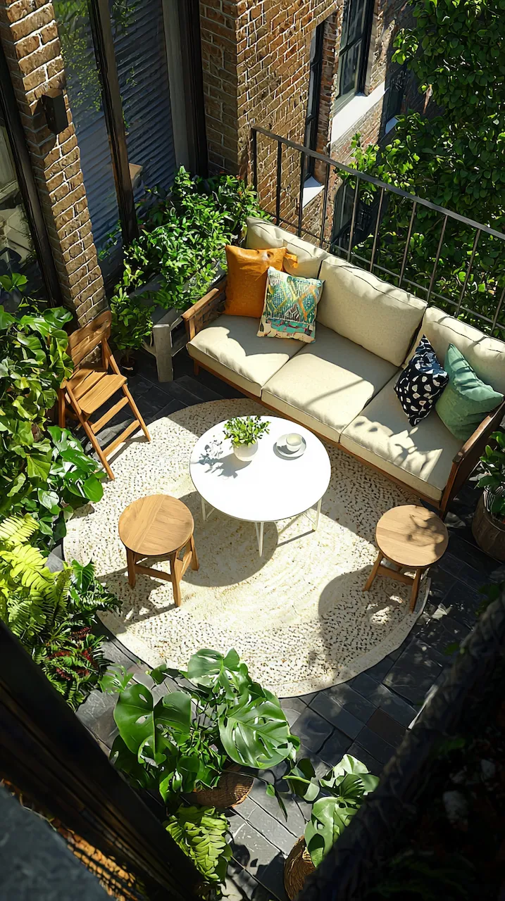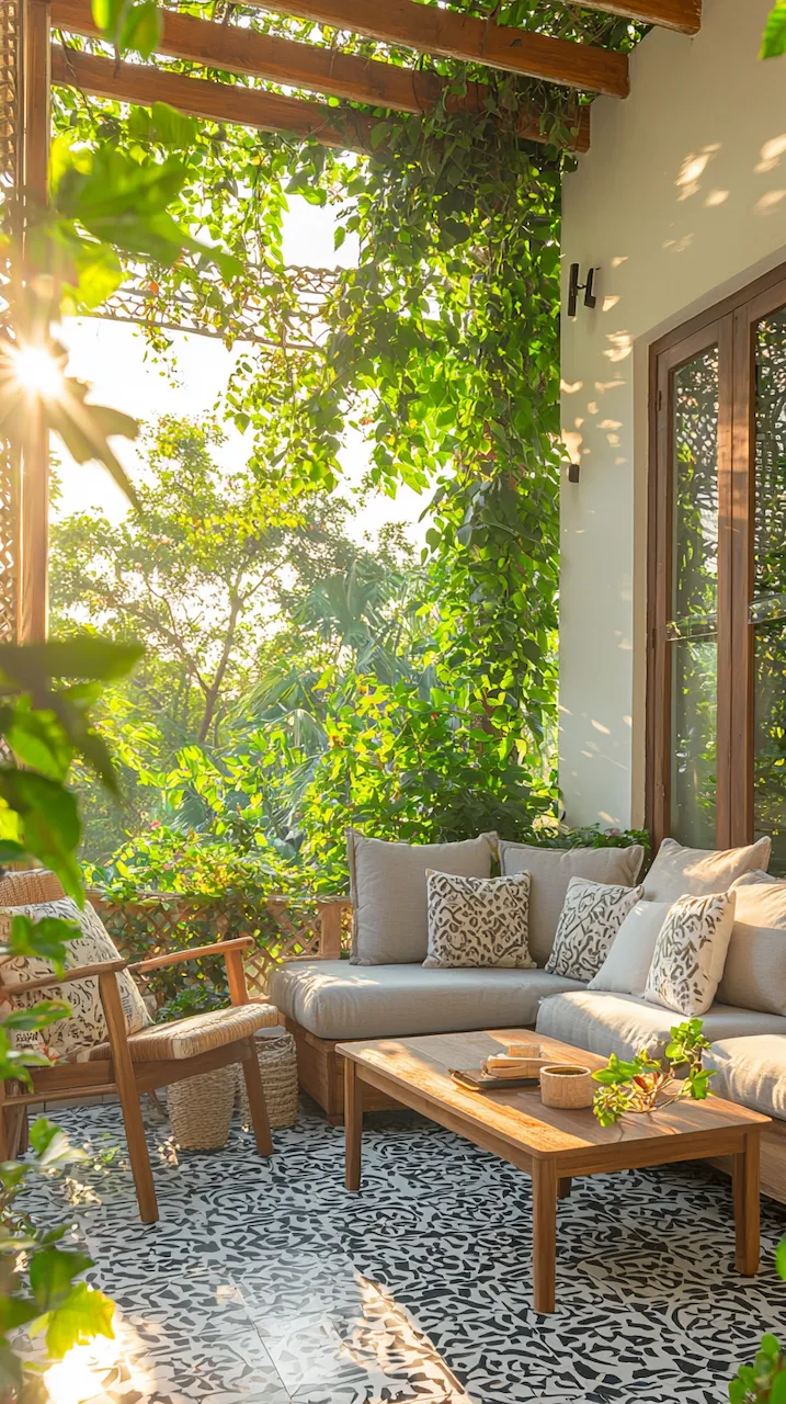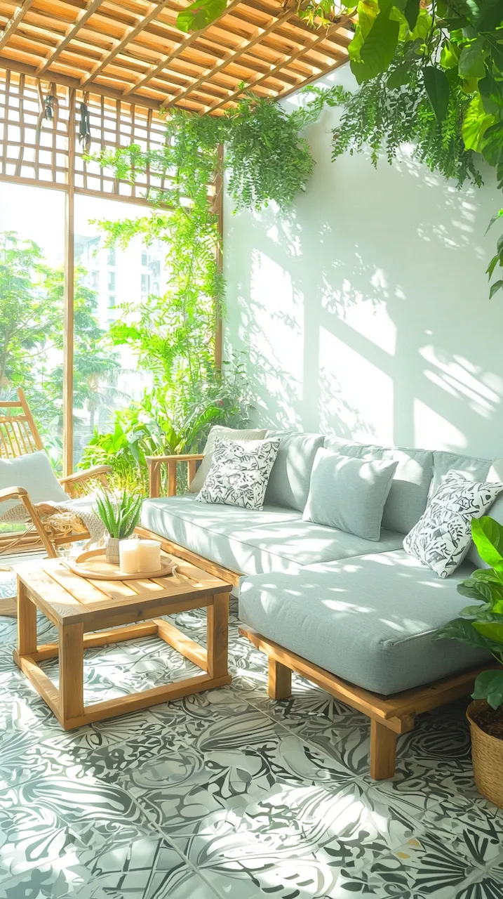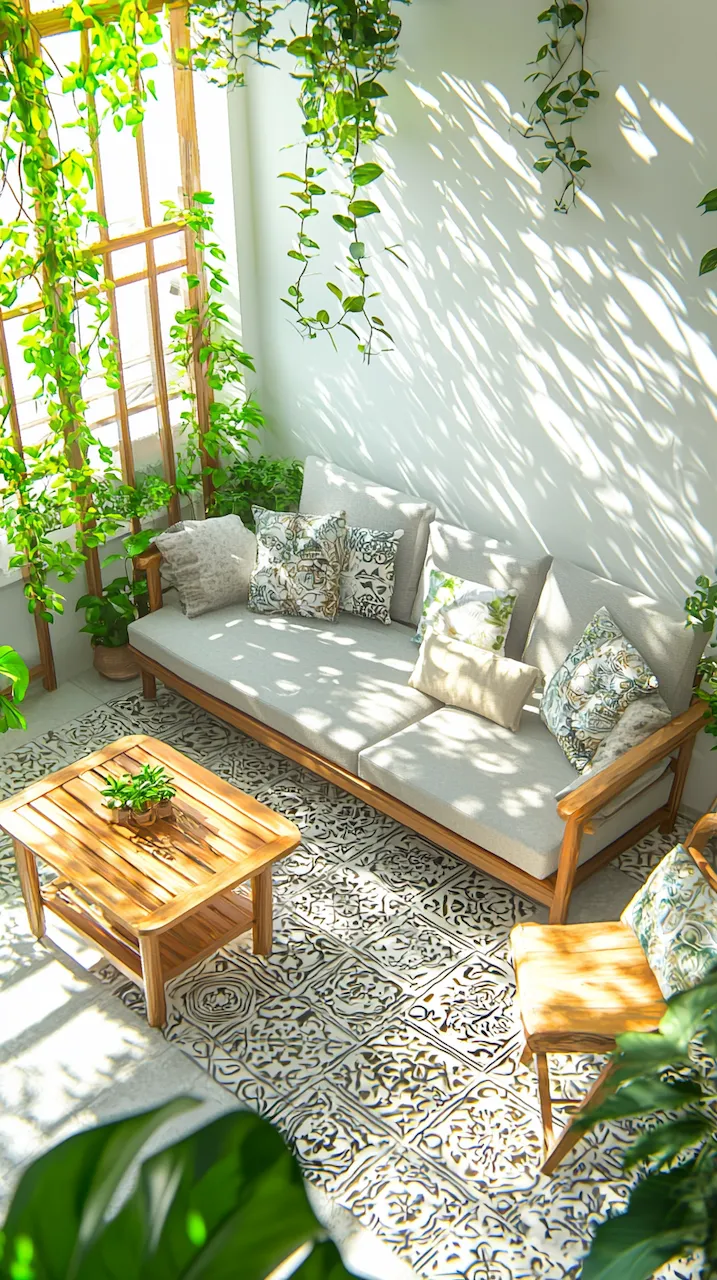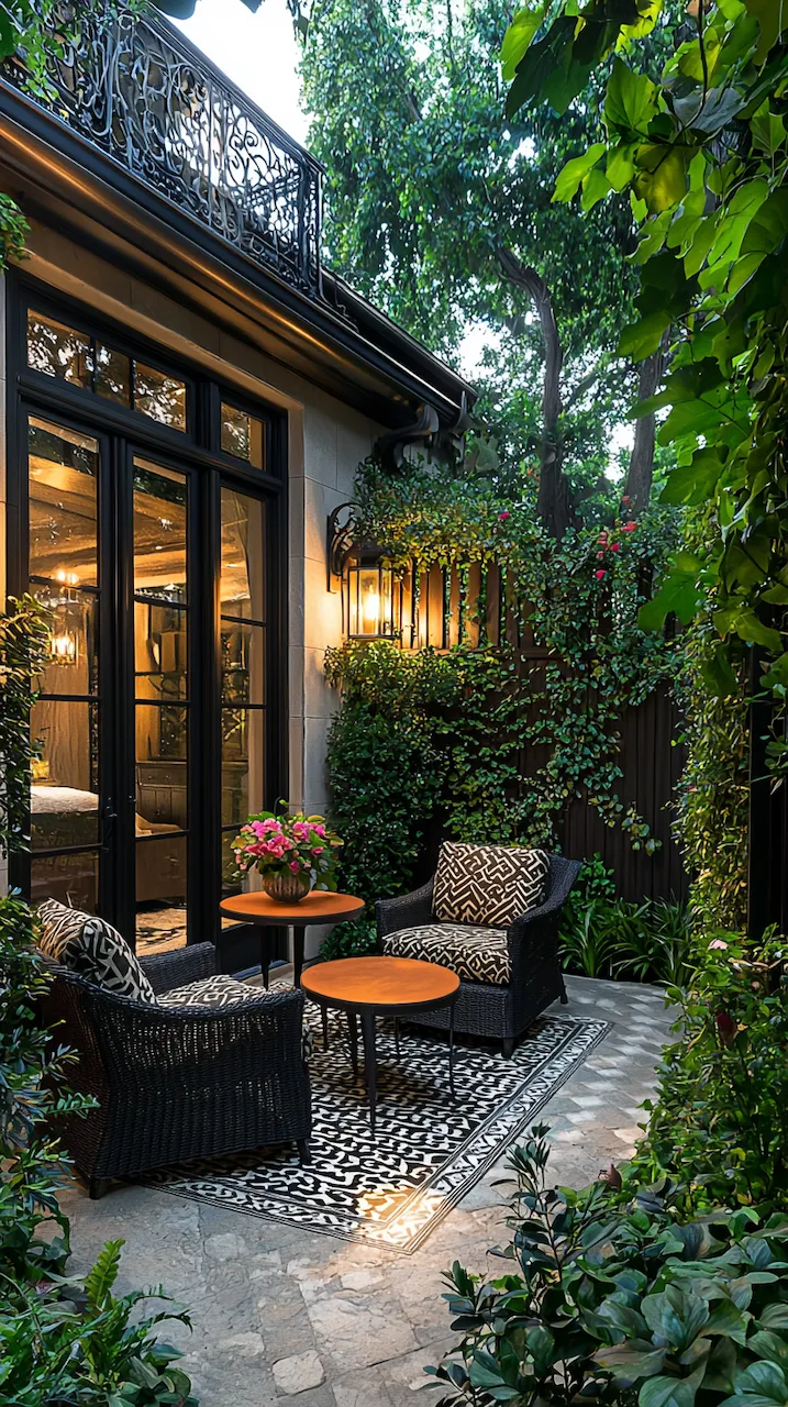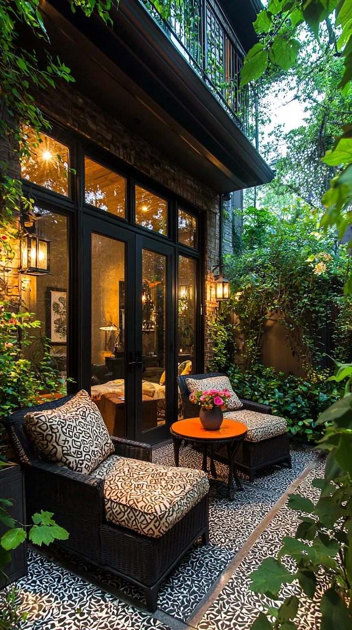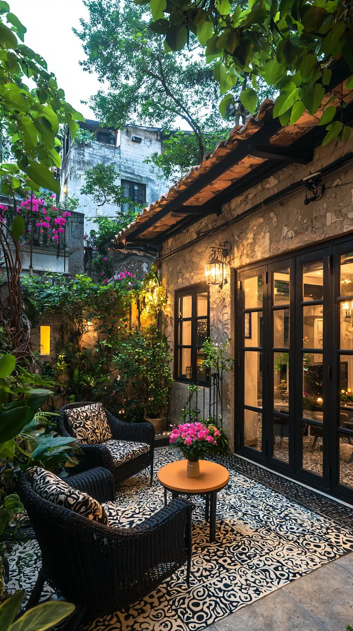 In a small patio, walls often do more than hold things up—they’re your canvas. Consider peel-and-stick tiles in patterns that echo Mediterranean kitchens. These details don’t scream. They simmer.