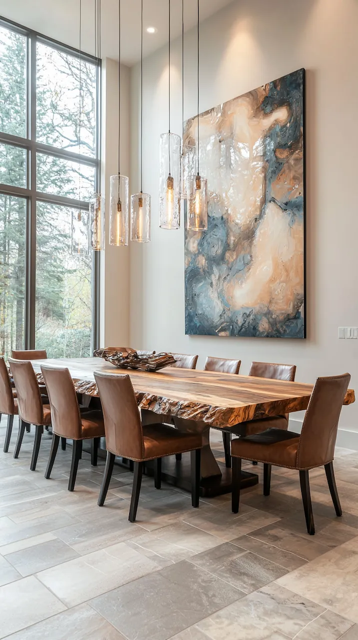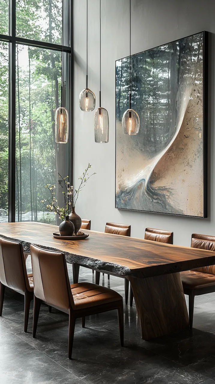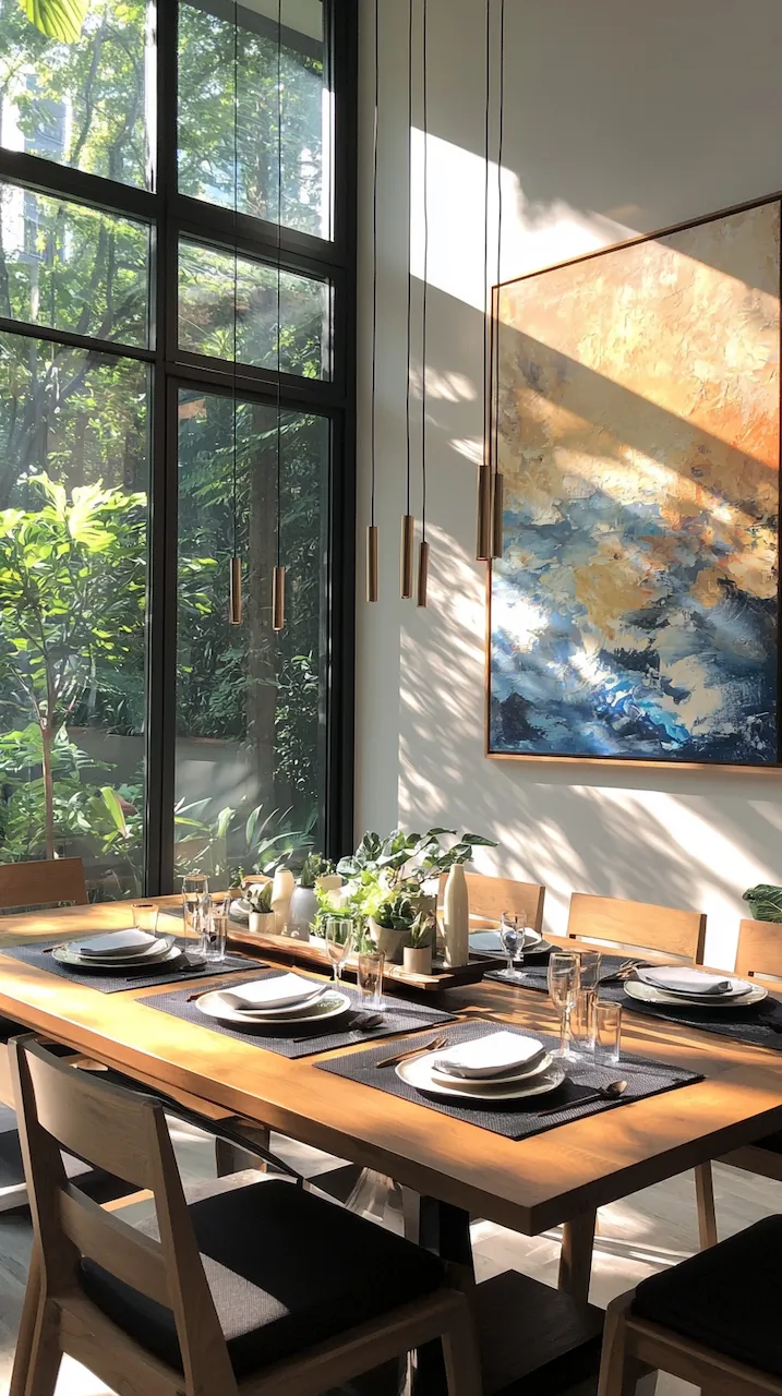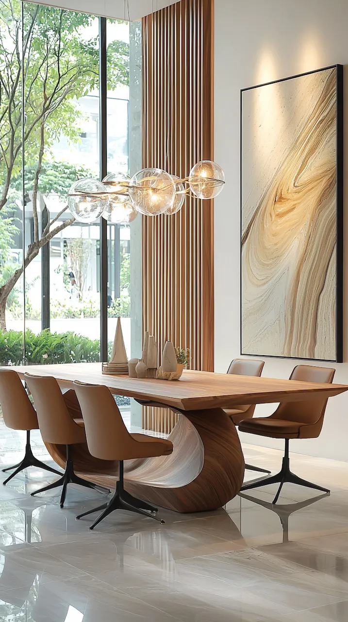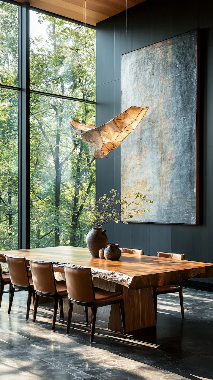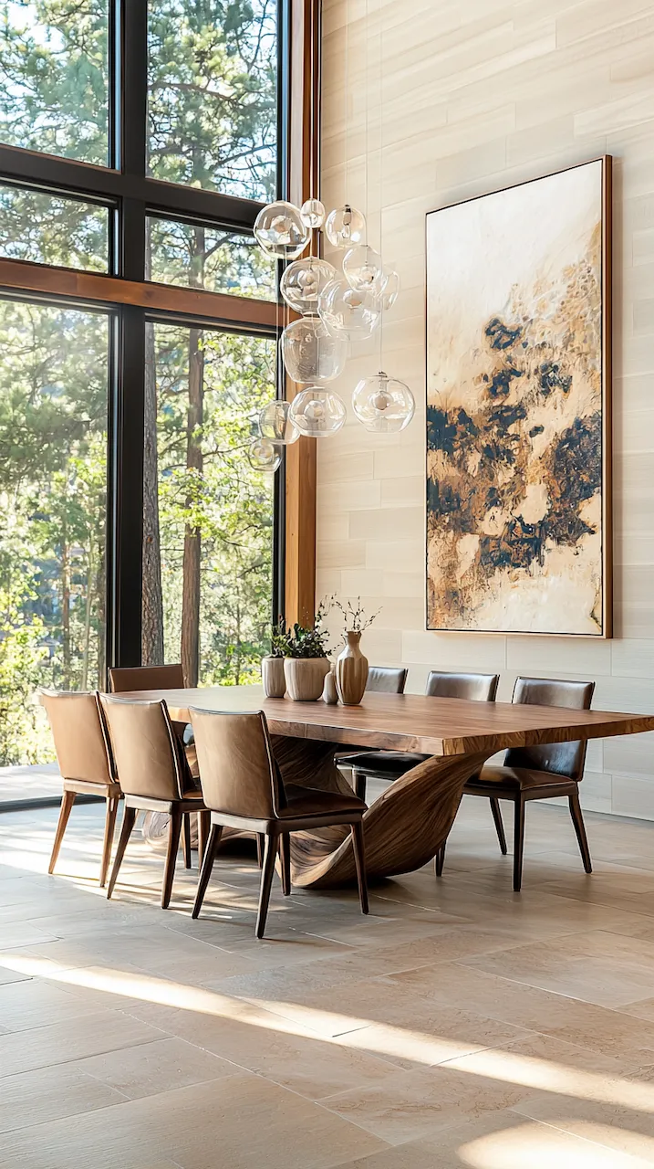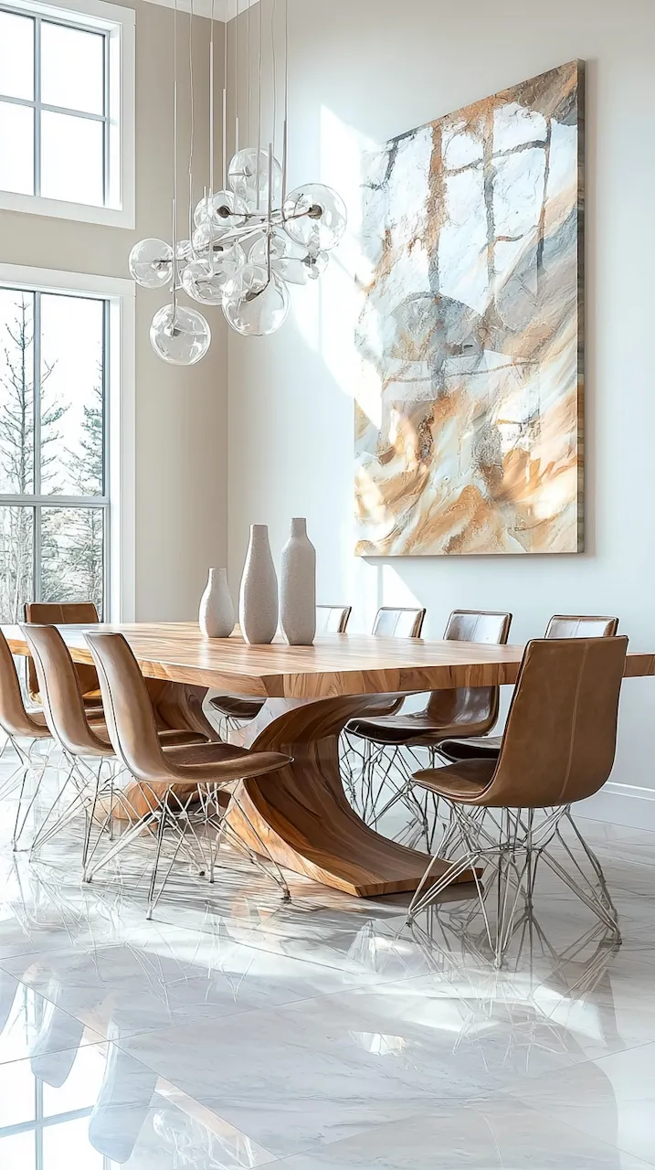 Lighting completes the composition. Above the table, a fixture might float like a satellite—a minimalist ring of LED light, or a kinetic mobile inspired by Calder. These pieces do more than illuminate. They choreograph the room’s energy, casting subtle shadows and creating focal points that evolve throughout the day. Even natural light becomes a design material, filtered through linen sheers or fractured through textured glass.