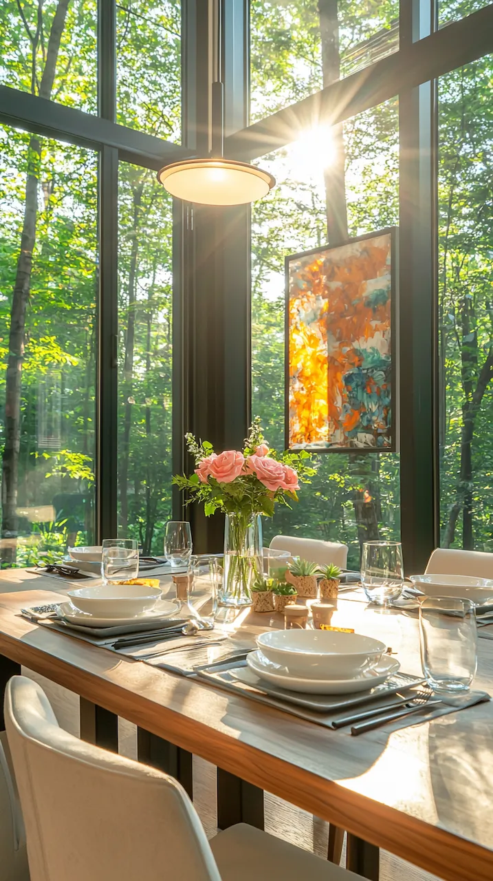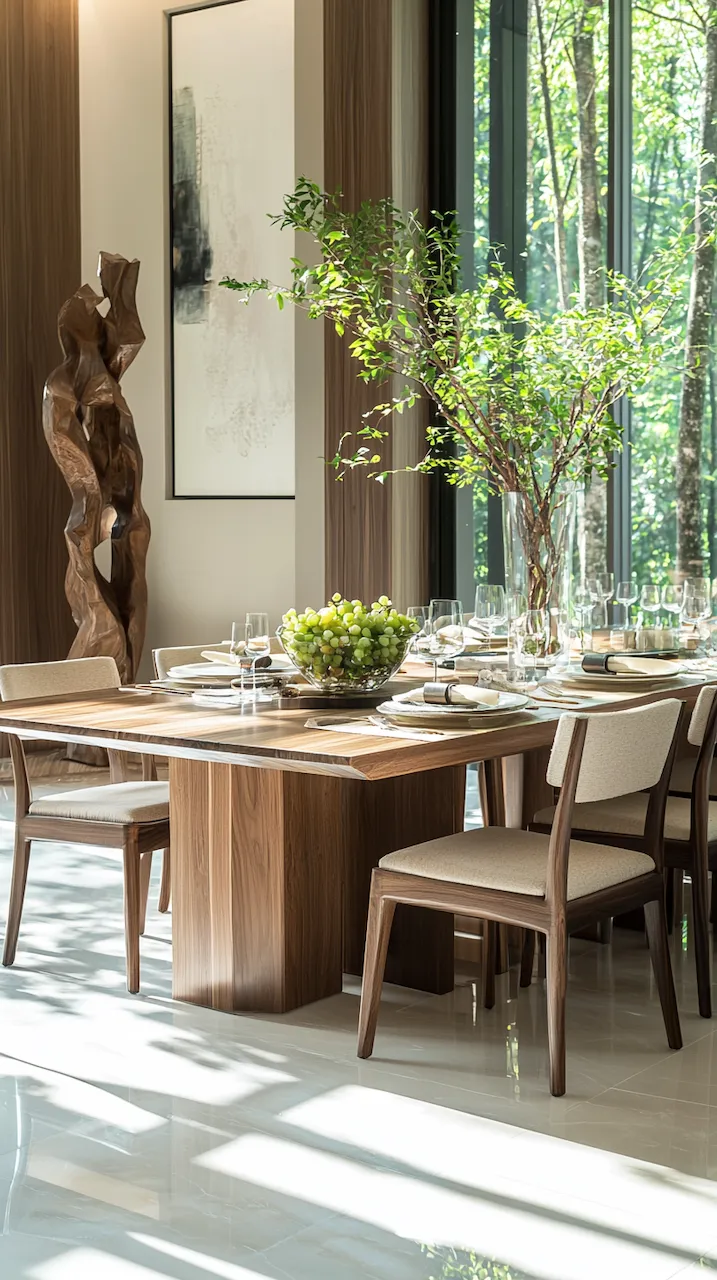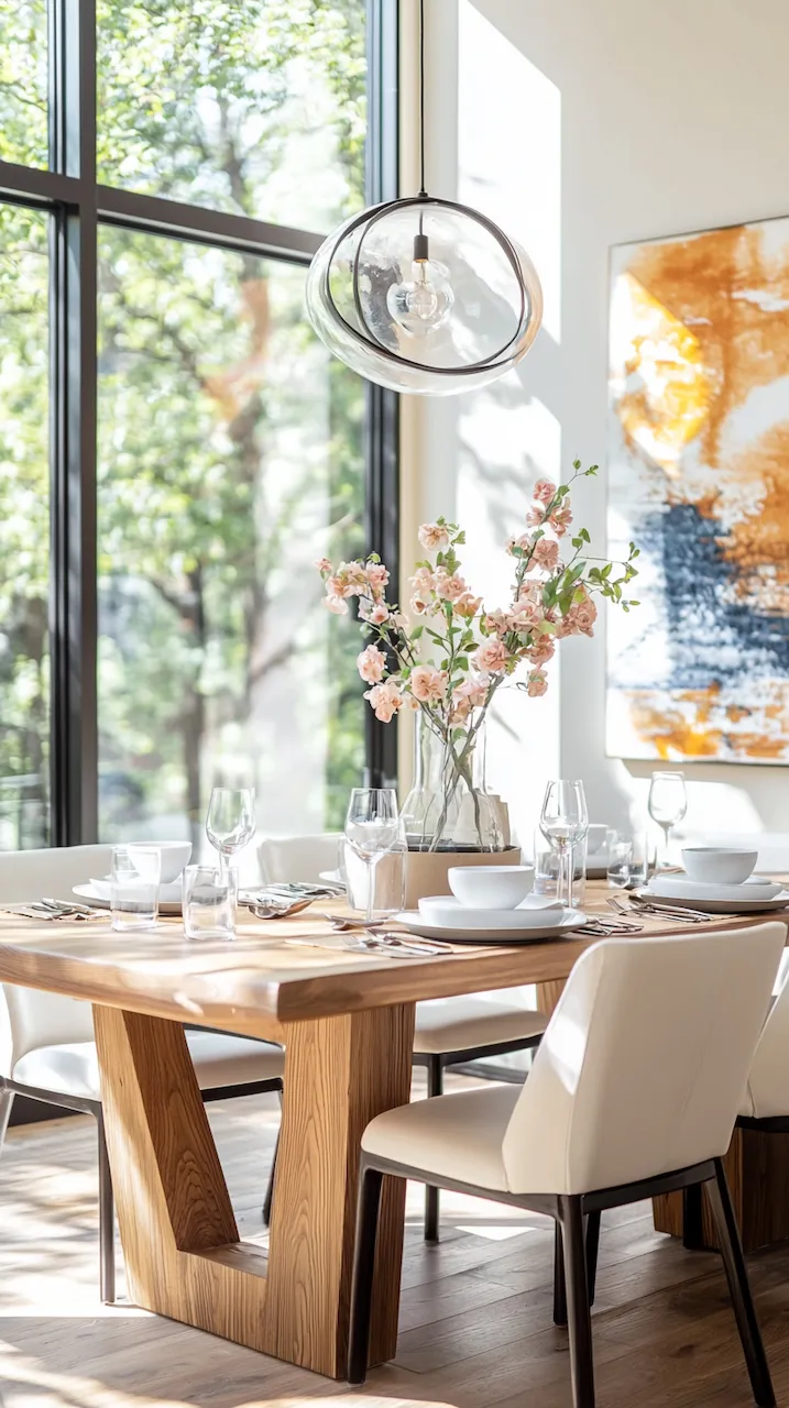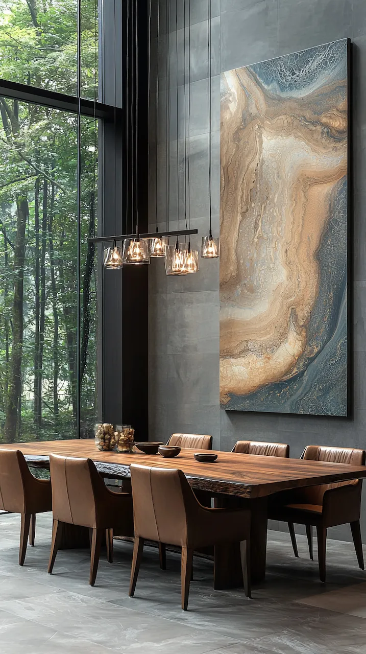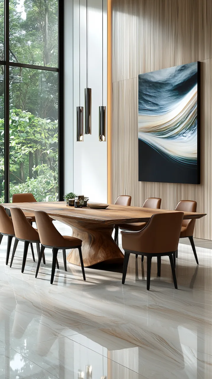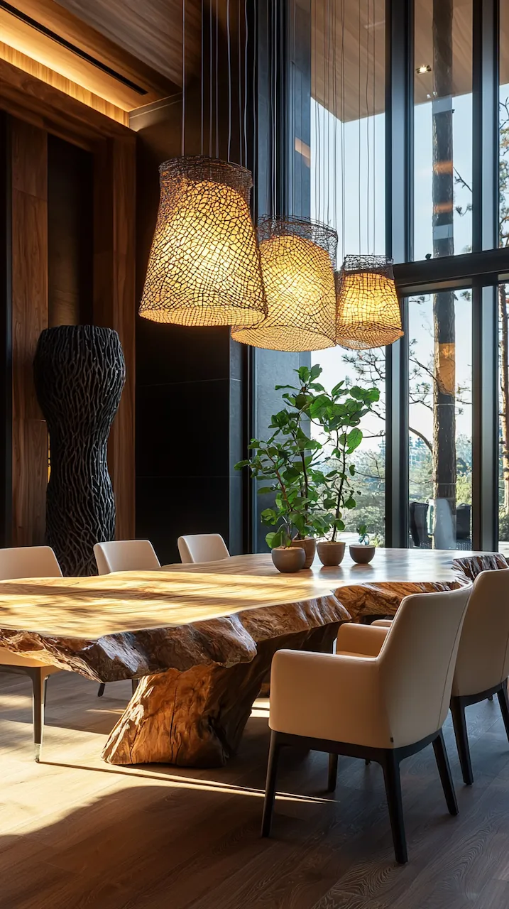 Lighting completes the composition. Above the table, a fixture might float like a satellite—a minimalist ring of LED light, or a kinetic mobile inspired by Calder. These pieces do more than illuminate. They choreograph the room’s energy, casting subtle shadows and creating focal points that evolve throughout the day. Even natural light becomes a design material, filtered through linen sheers or fractured through textured glass.