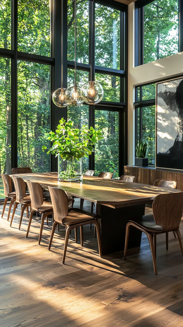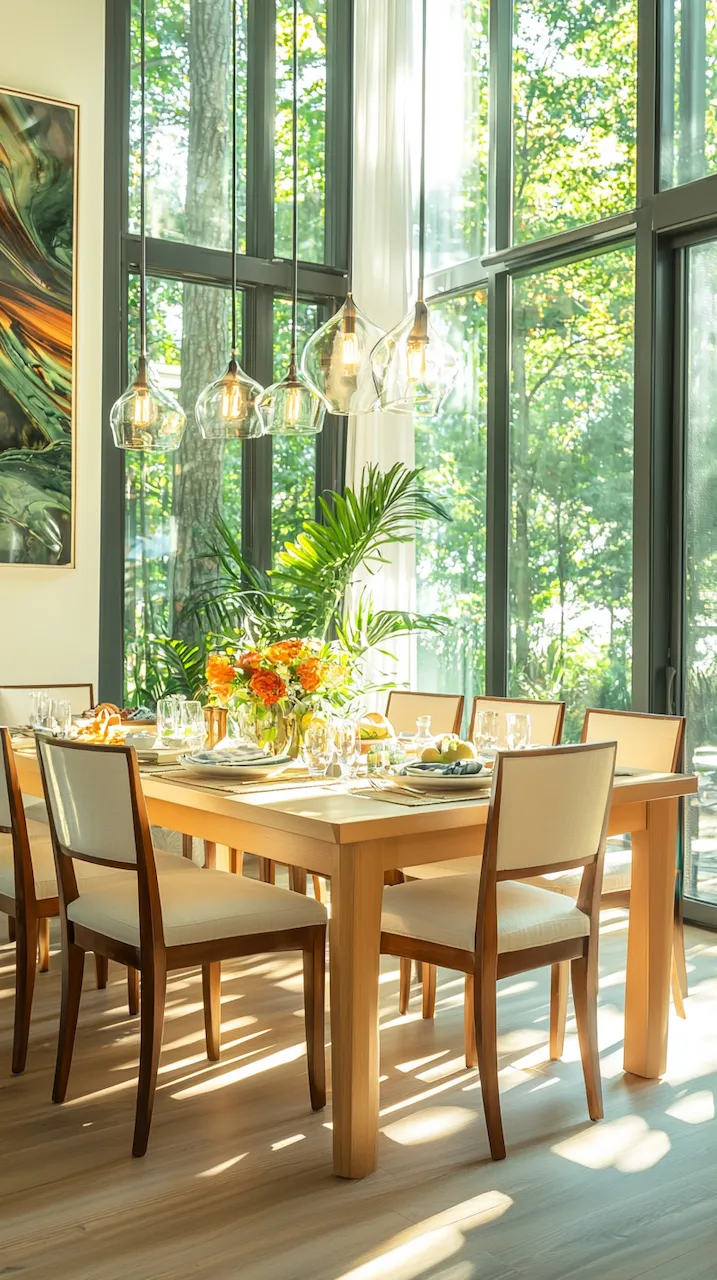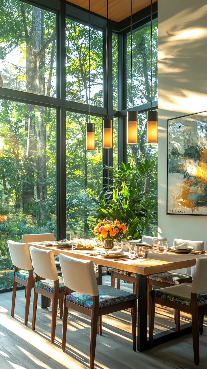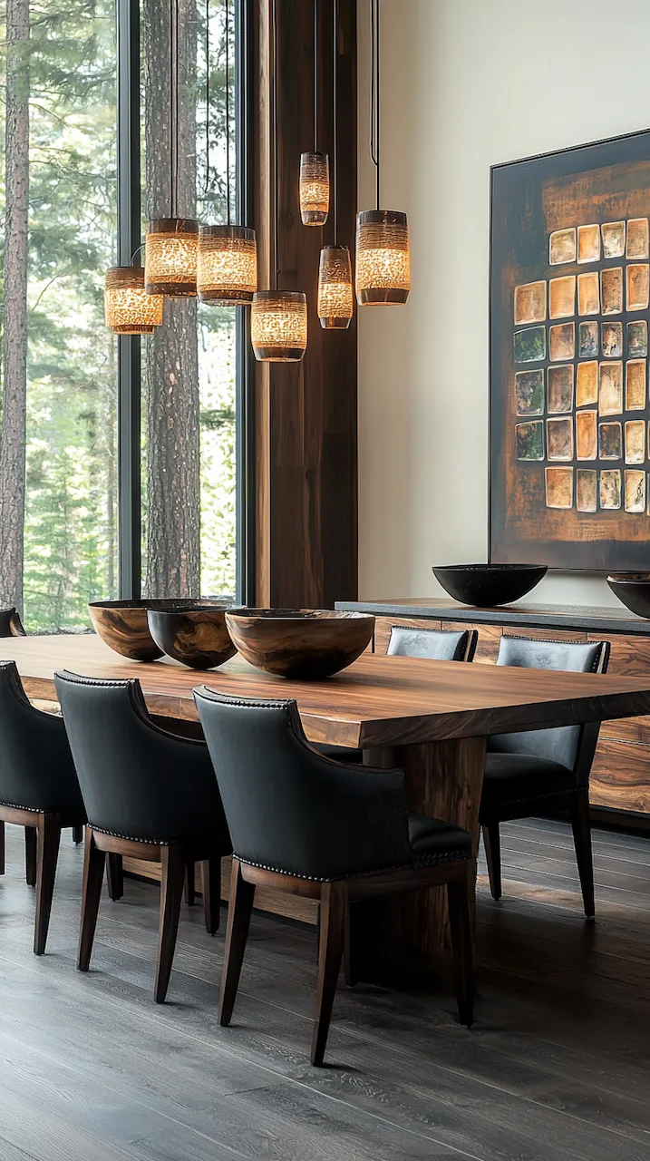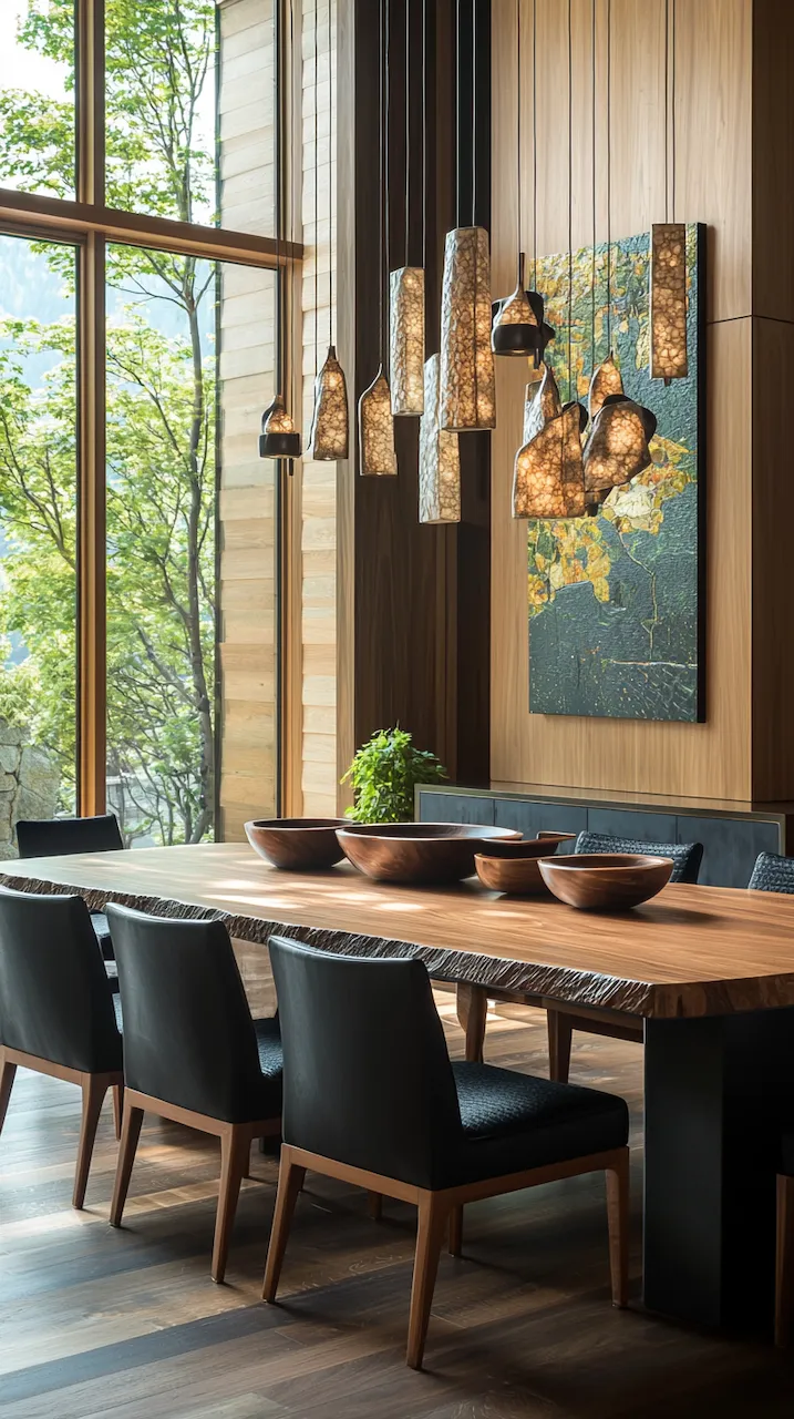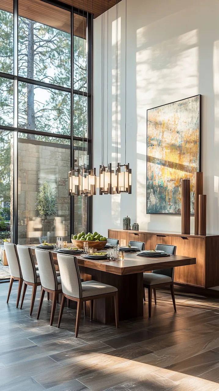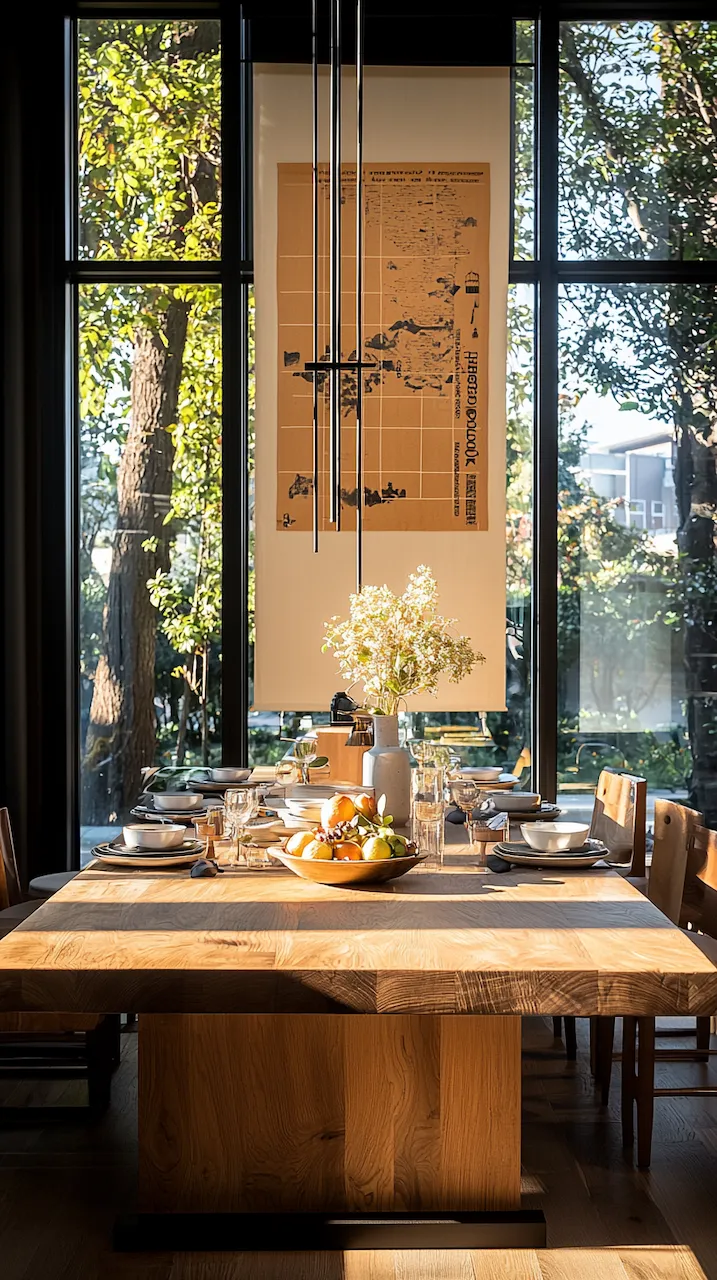 Lighting completes the composition. Above the table, a fixture might float like a satellite—a minimalist ring of LED light, or a kinetic mobile inspired by Calder. These pieces do more than illuminate. They choreograph the room’s energy, casting subtle shadows and creating focal points that evolve throughout the day. Even natural light becomes a design material, filtered through linen sheers or fractured through textured glass.