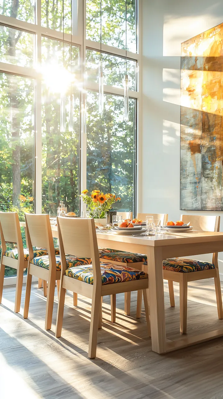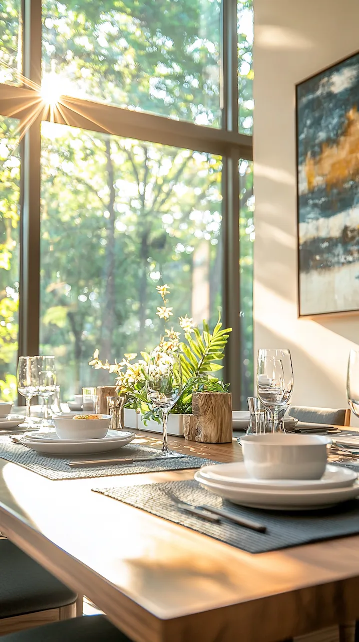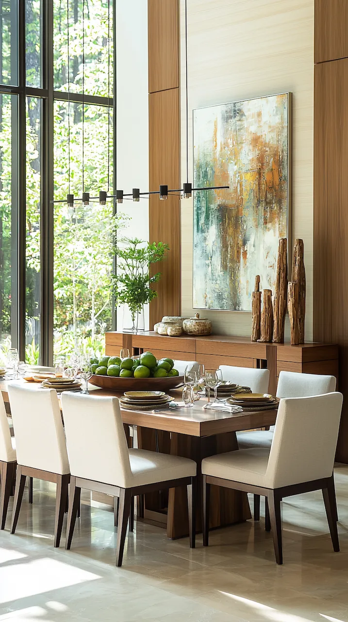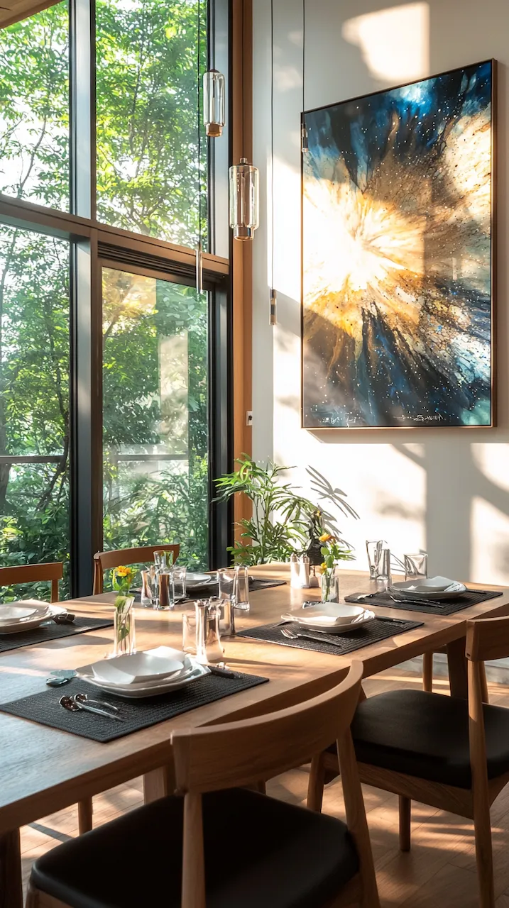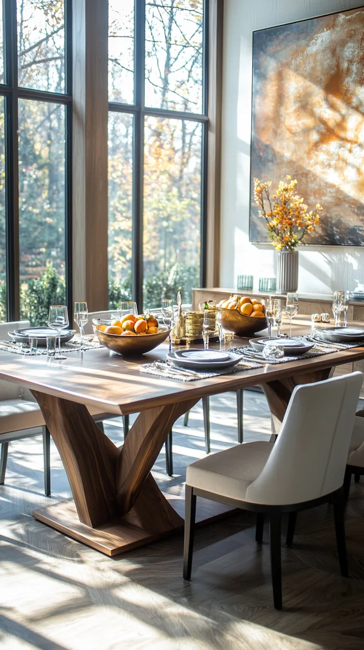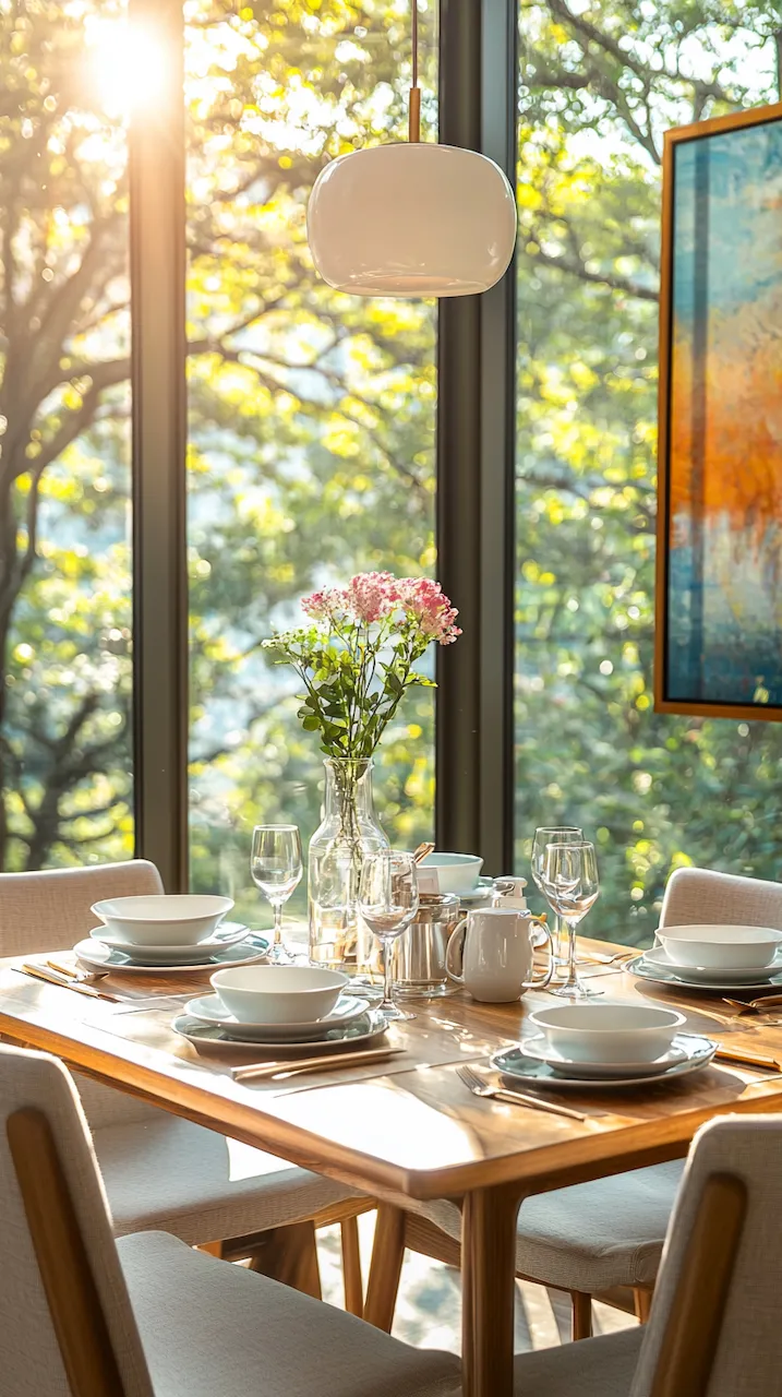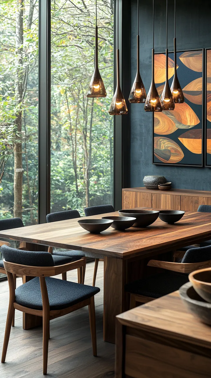 Lighting completes the composition. Above the table, a fixture might float like a satellite—a minimalist ring of LED light, or a kinetic mobile inspired by Calder. These pieces do more than illuminate. They choreograph the room’s energy, casting subtle shadows and creating focal points that evolve throughout the day. Even natural light becomes a design material, filtered through linen sheers or fractured through textured glass.