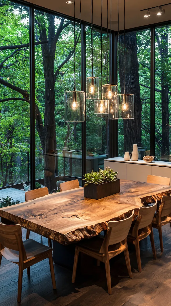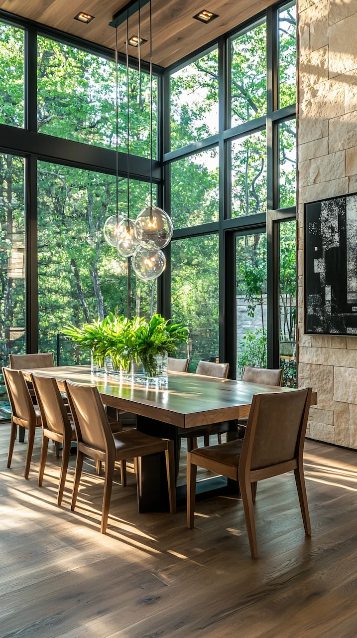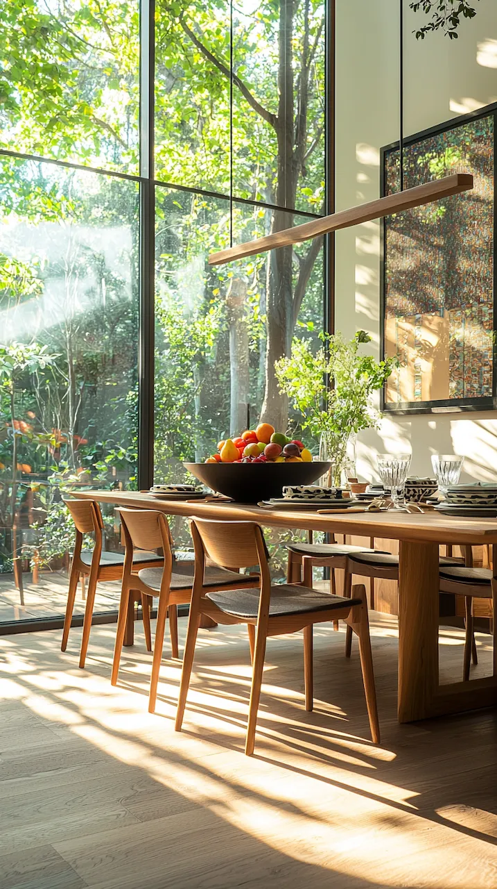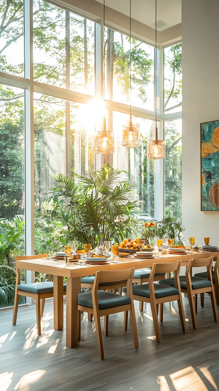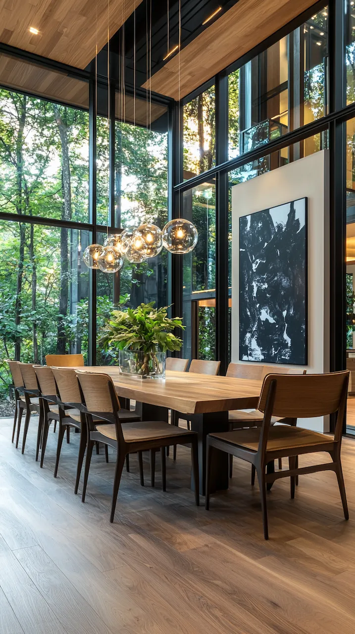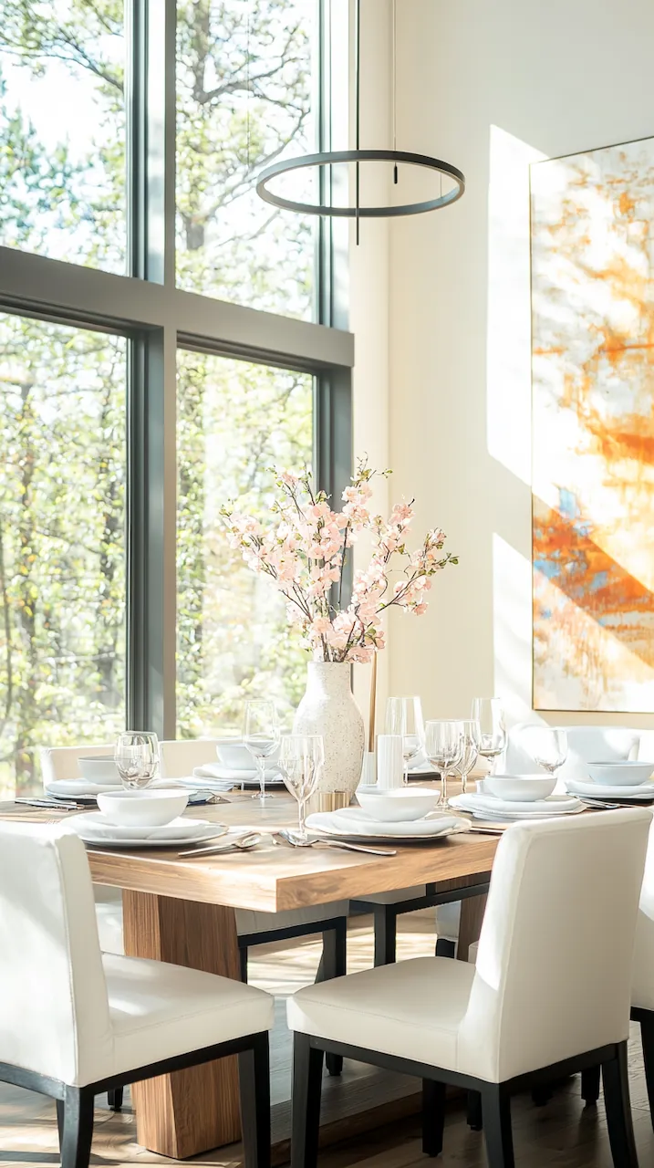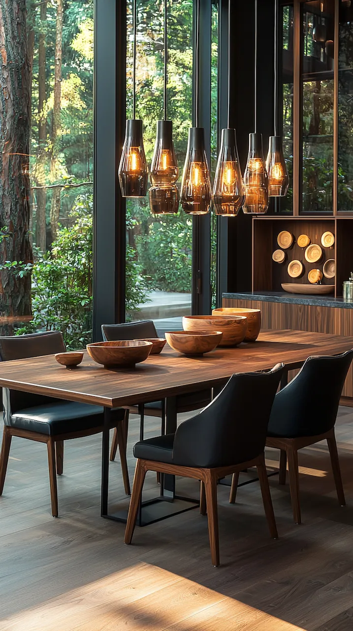 Lighting completes the composition. Above the table, a fixture might float like a satellite—a minimalist ring of LED light, or a kinetic mobile inspired by Calder. These pieces do more than illuminate. They choreograph the room’s energy, casting subtle shadows and creating focal points that evolve throughout the day. Even natural light becomes a design material, filtered through linen sheers or fractured through textured glass.