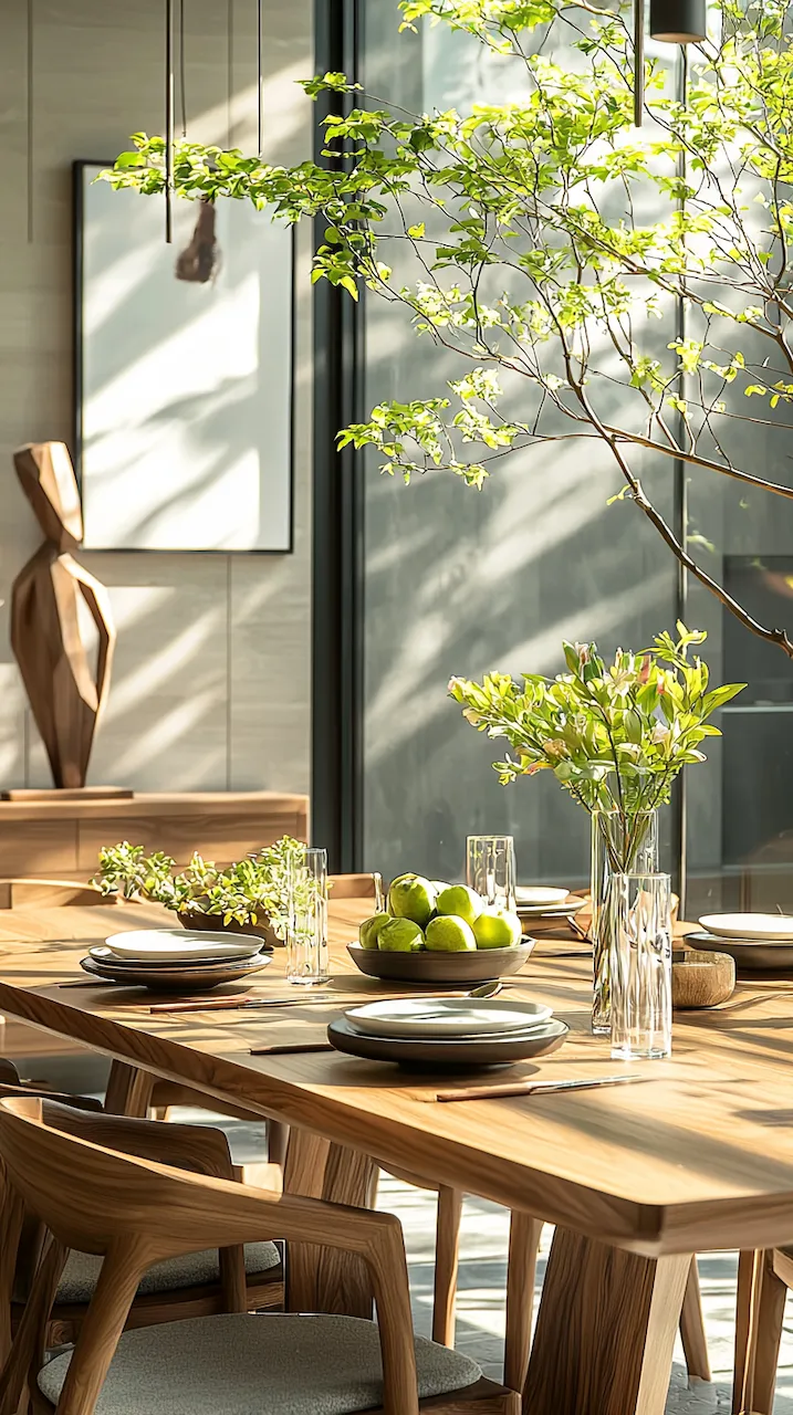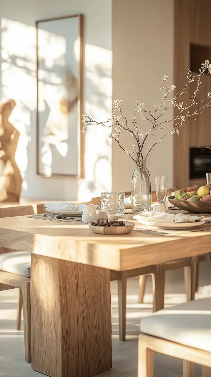 Storage, too, becomes sculpture. A low credenza in bleached ash may run parallel to the table, its surface curated with stoneware, dried botanicals, and tactile books. Open shelving is not for excess but for expression. This is a space designed to invite presence, not clutter.