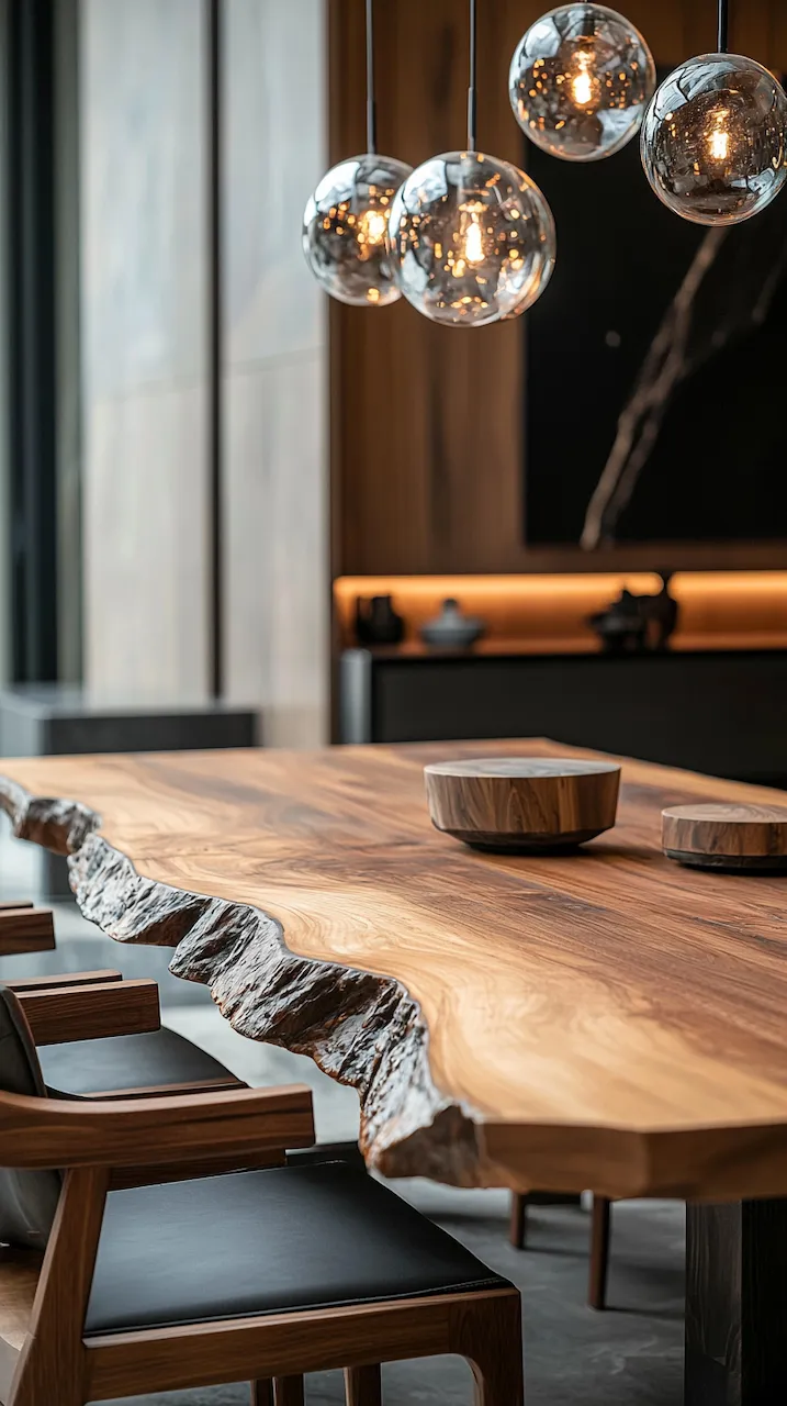 And that asymmetry radiates outward. The room built around such a table resists traditional rules. Chairs need not match. A trio of armless seats on one side can face off against a long banquette upholstered in textured velvet. Above, instead of a single centered pendant, lighting might consist of two staggered sconces or a cluster of globes hung at varying heights. This sense of deliberate imbalance activates the space, infusing it with energy.