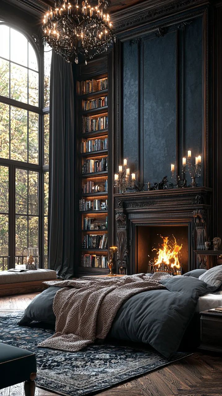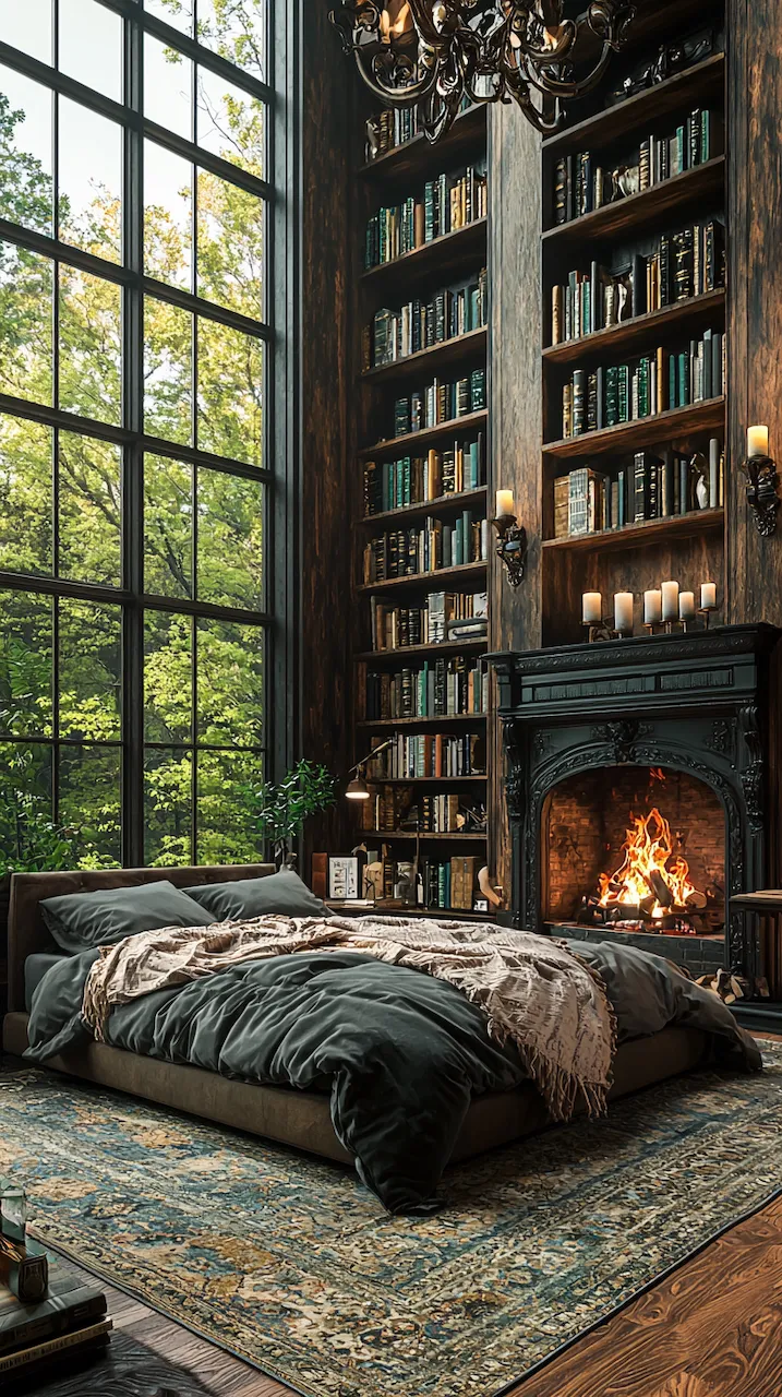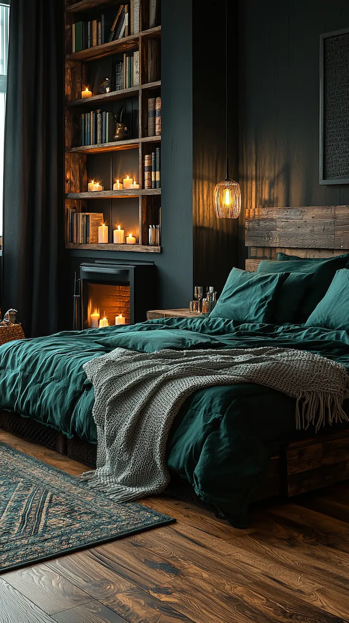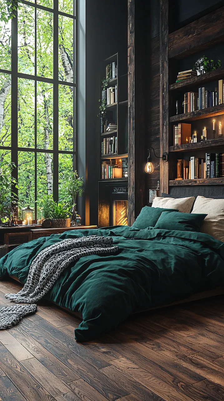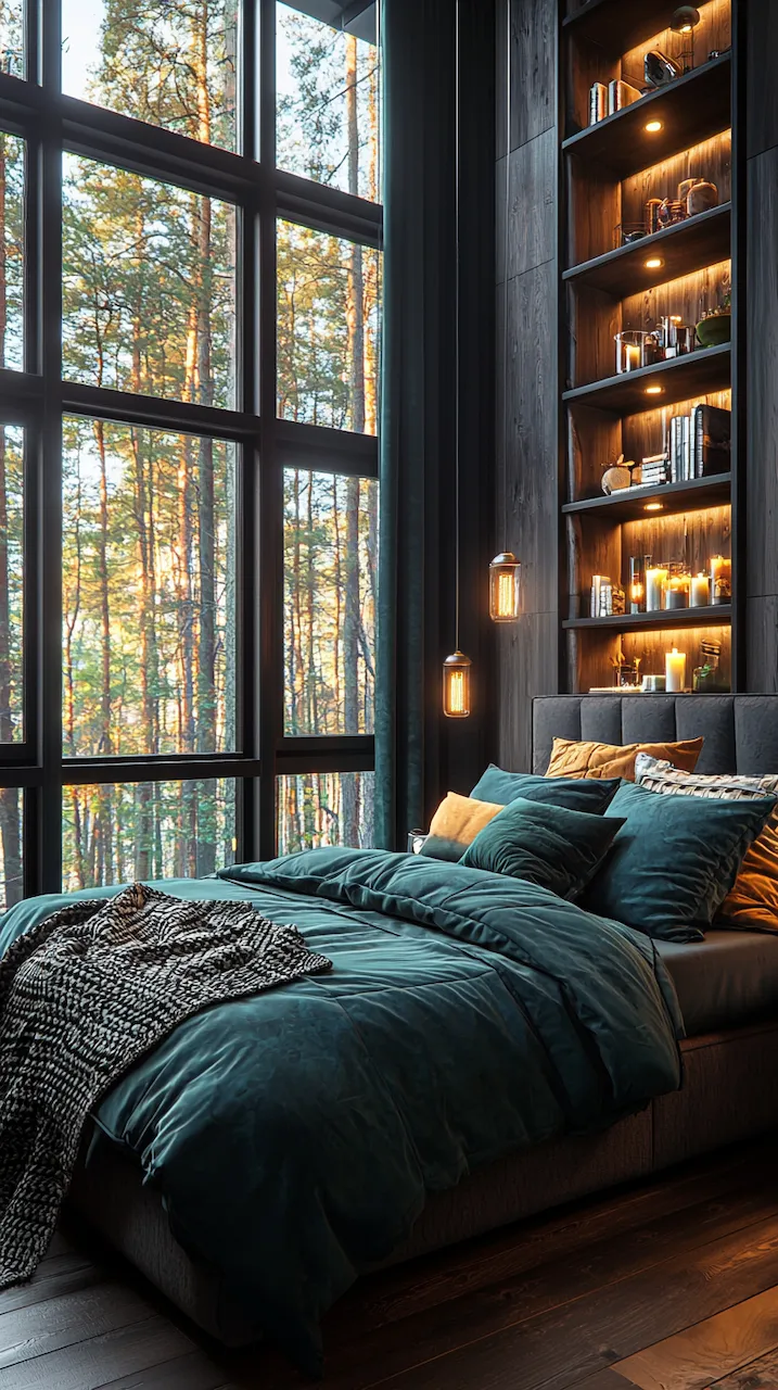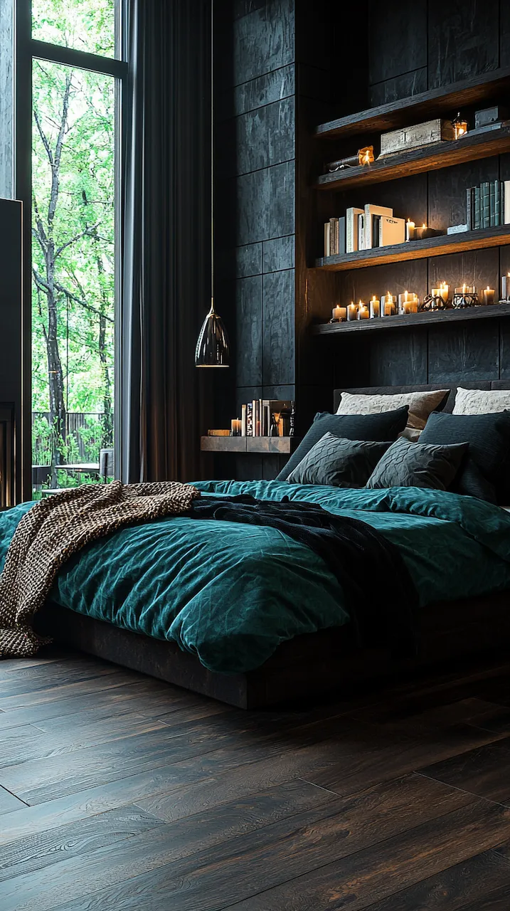 Built-ins become the unsung heroes of small or moody bedrooms. Floor-to-ceiling shelves in matte black or deep walnut provide vertical interest while housing curated collections that soften the intensity of dark tones. Think stacked art books, ceramics in muted glazes, or even color-blocked vintage novels arranged with sculptural intent. These built-ins function like gallery walls: curated, storytelling, and deeply personal.