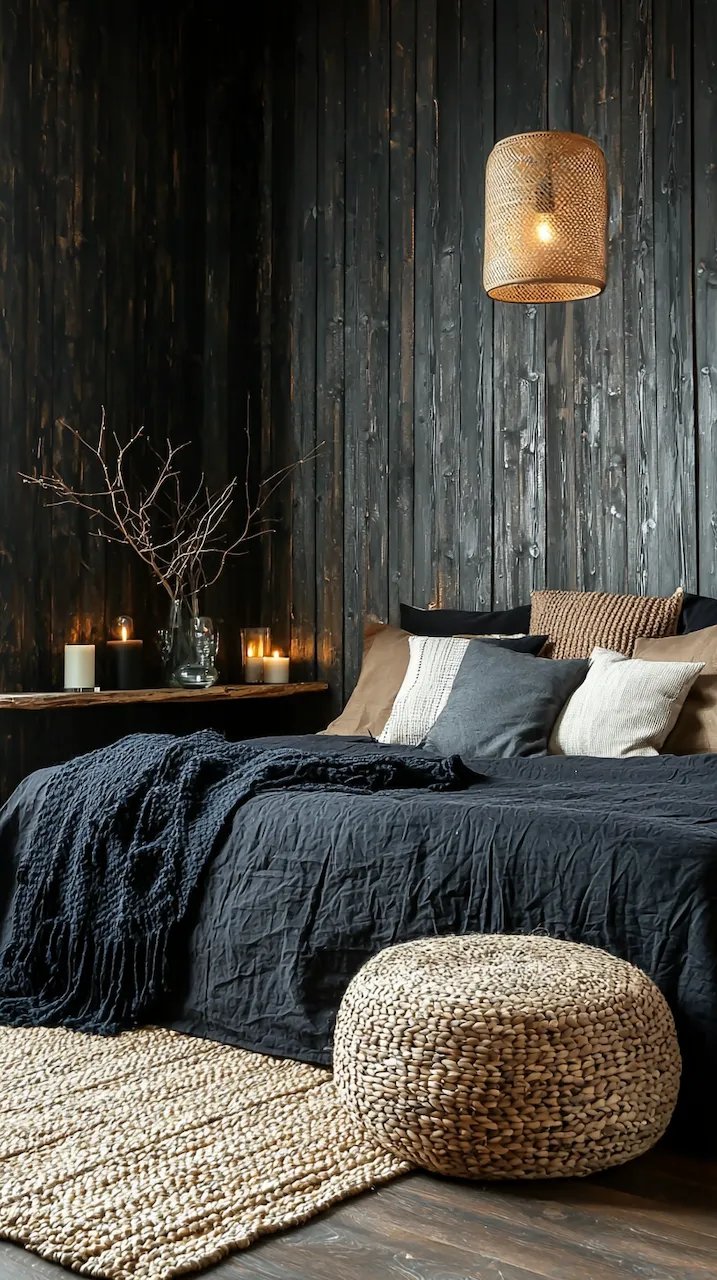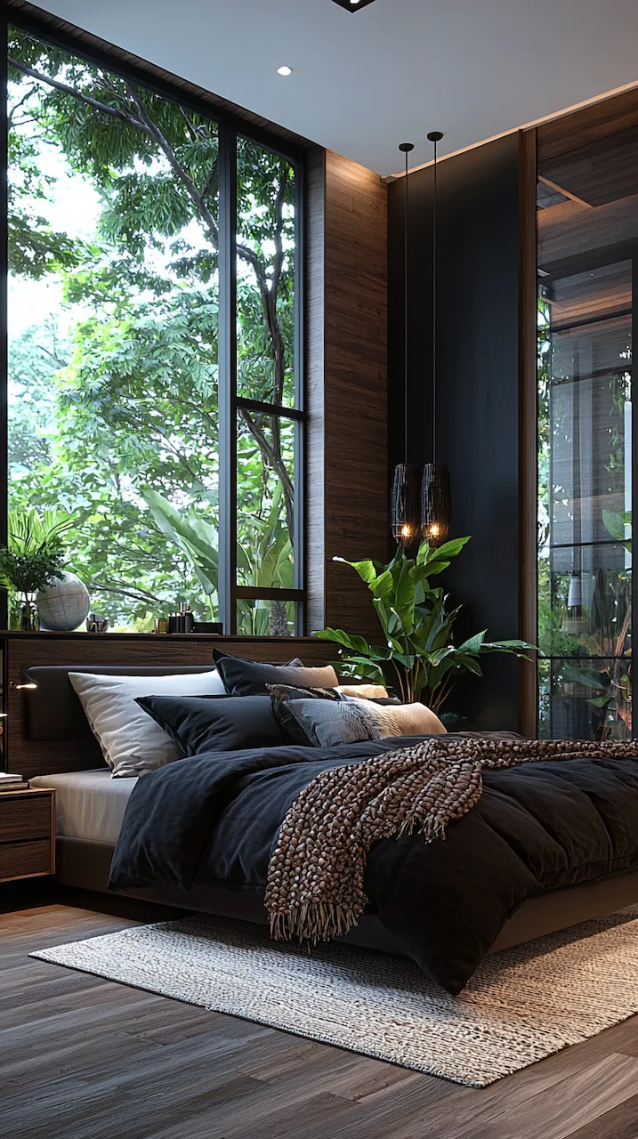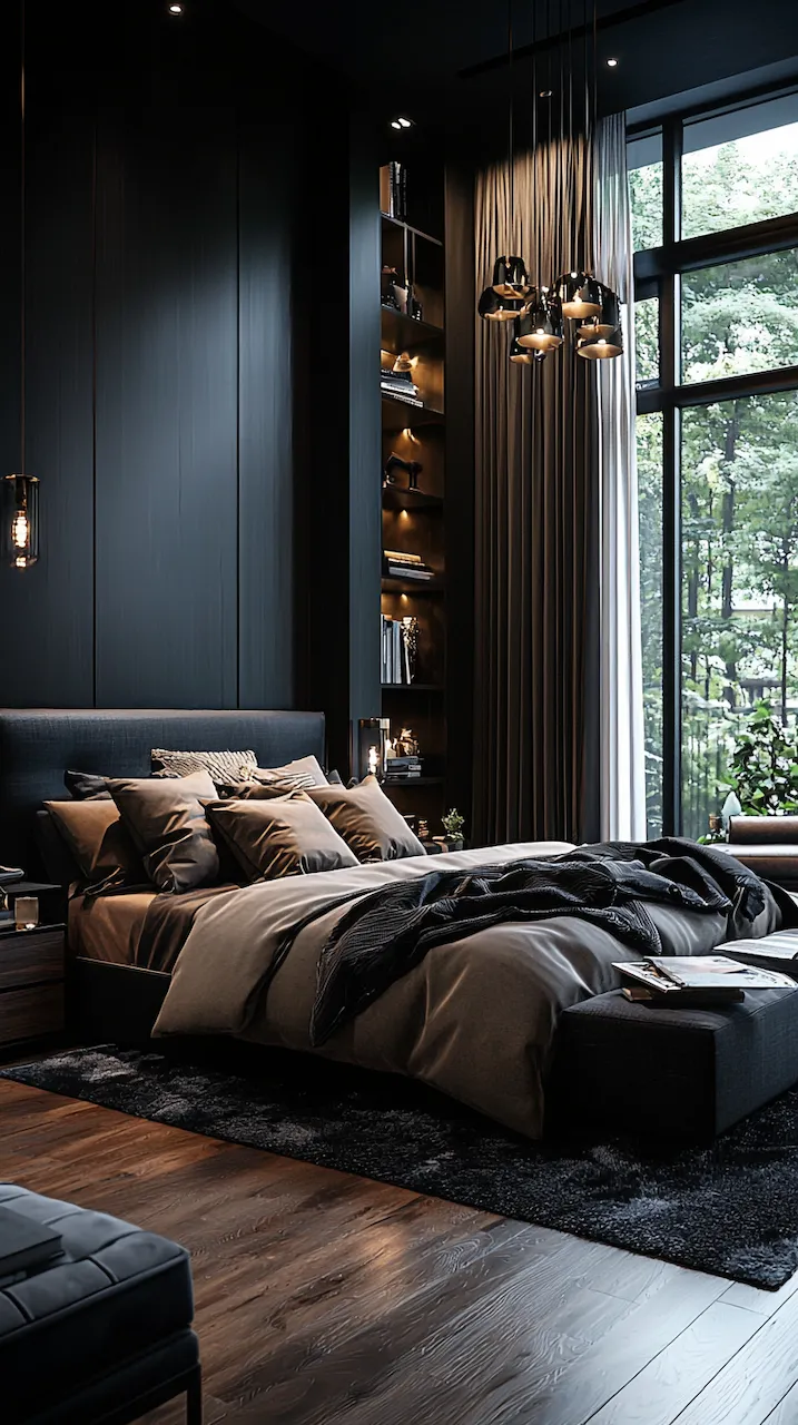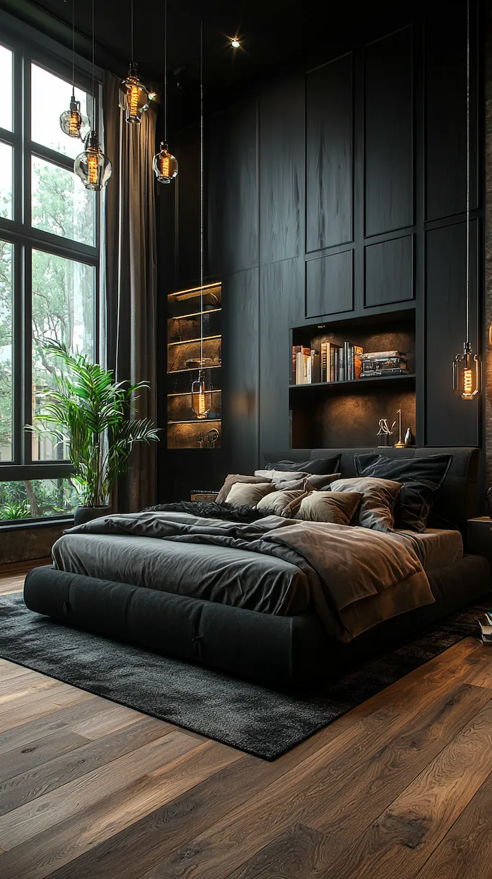 The power of asymmetry in dark-accented bedrooms is that it challenges the eye and rewards the observer. A singular pendant light, for instance, may hang to the left of the bed, casting a pool of soft golden light over a sculptural chair in marbled resin. On the opposite side, perhaps a built-in shelf floats mid-wall, hosting a rotating collection of design books, vintage Polaroids, and ceramics that look like they were dug from a Scandinavian forest.