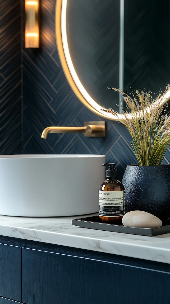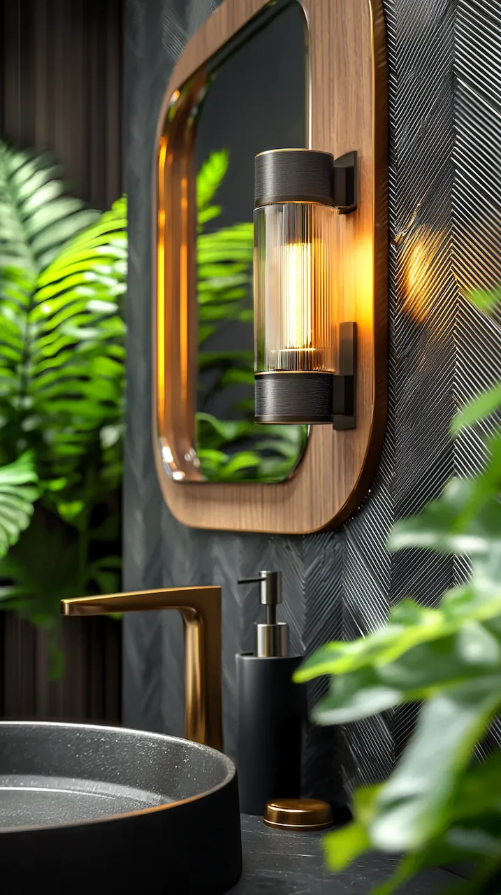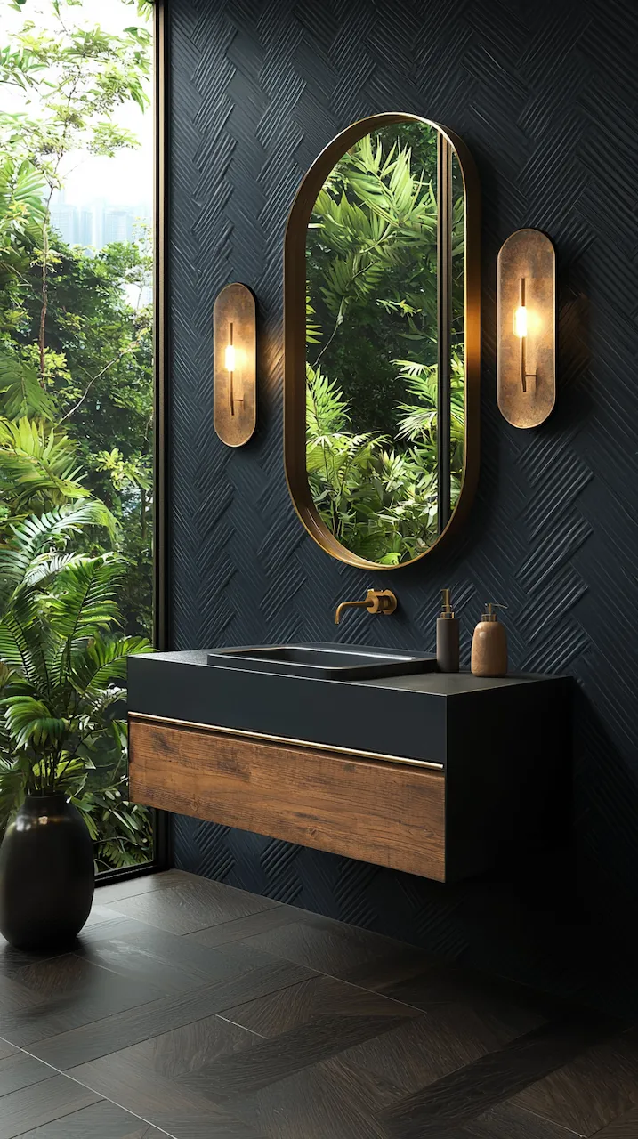 Lighting, too, plays a structural role. Think not only about brightness but about how light moves across surfaces. Under-cabinet LED strips emphasize the floating effect of a vanity, while backlit mirrors turn reflections into architectural events. Sconces in matte black or aged brass act like architectural brackets, holding the visual weight of the room in place.