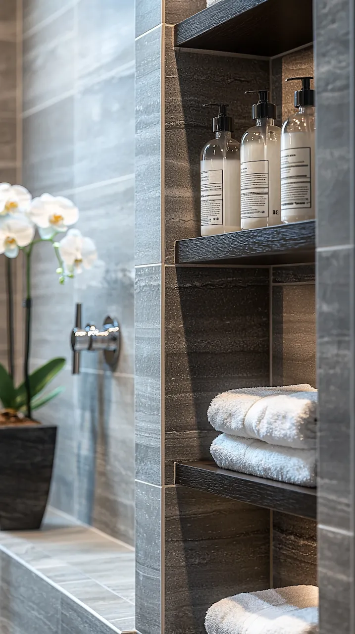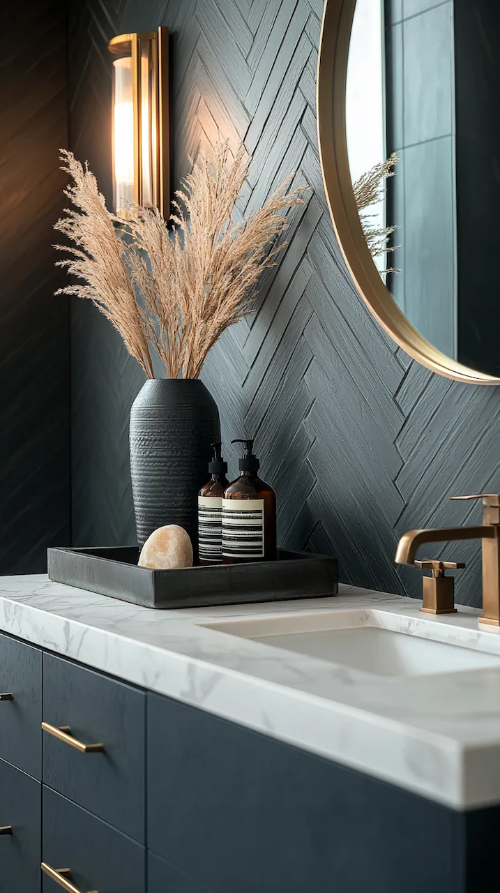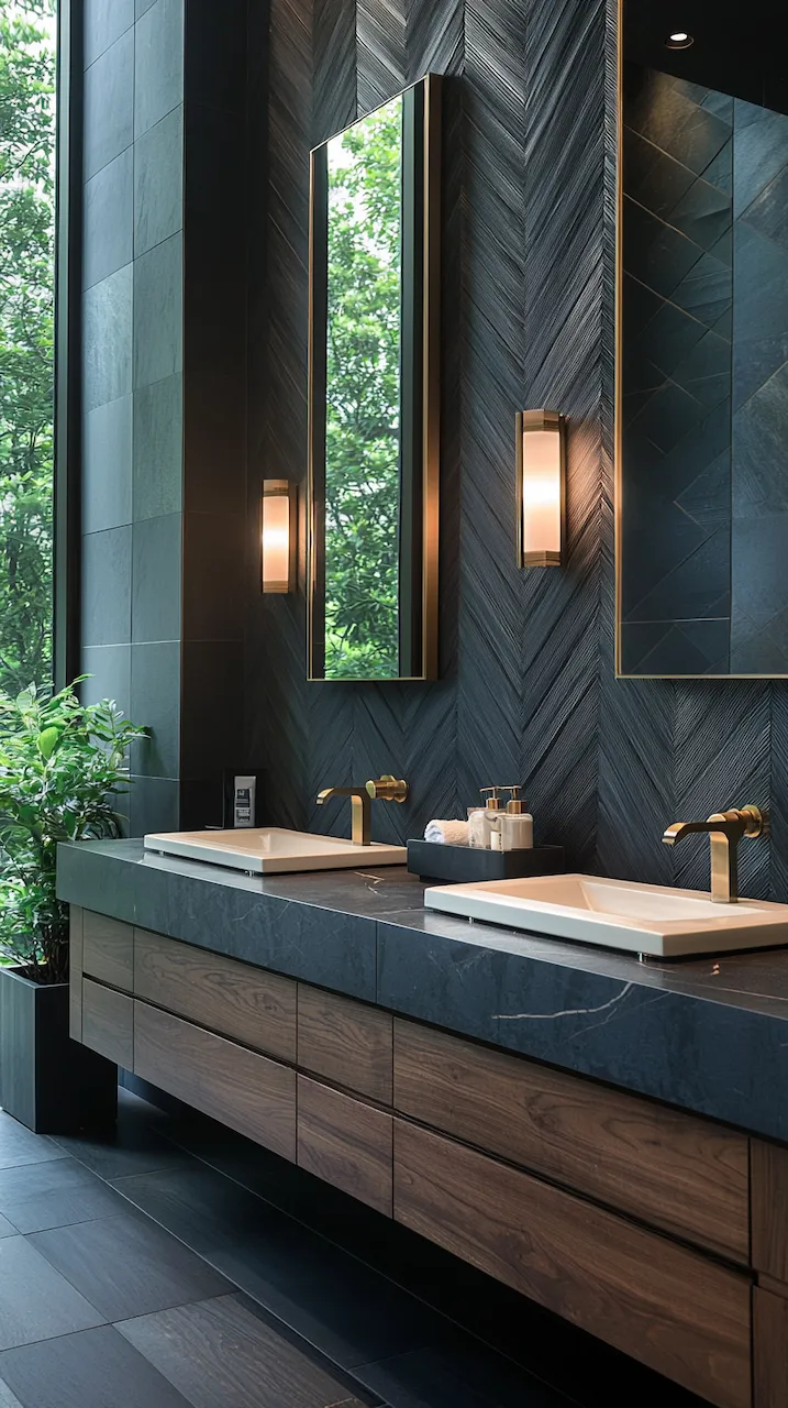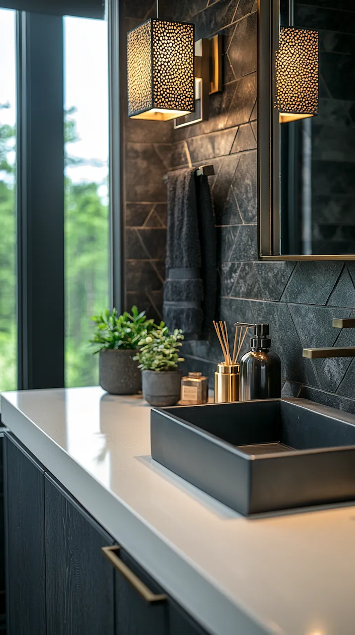 Lighting, too, plays a structural role. Think not only about brightness but about how light moves across surfaces. Under-cabinet LED strips emphasize the floating effect of a vanity, while backlit mirrors turn reflections into architectural events. Sconces in matte black or aged brass act like architectural brackets, holding the visual weight of the room in place.