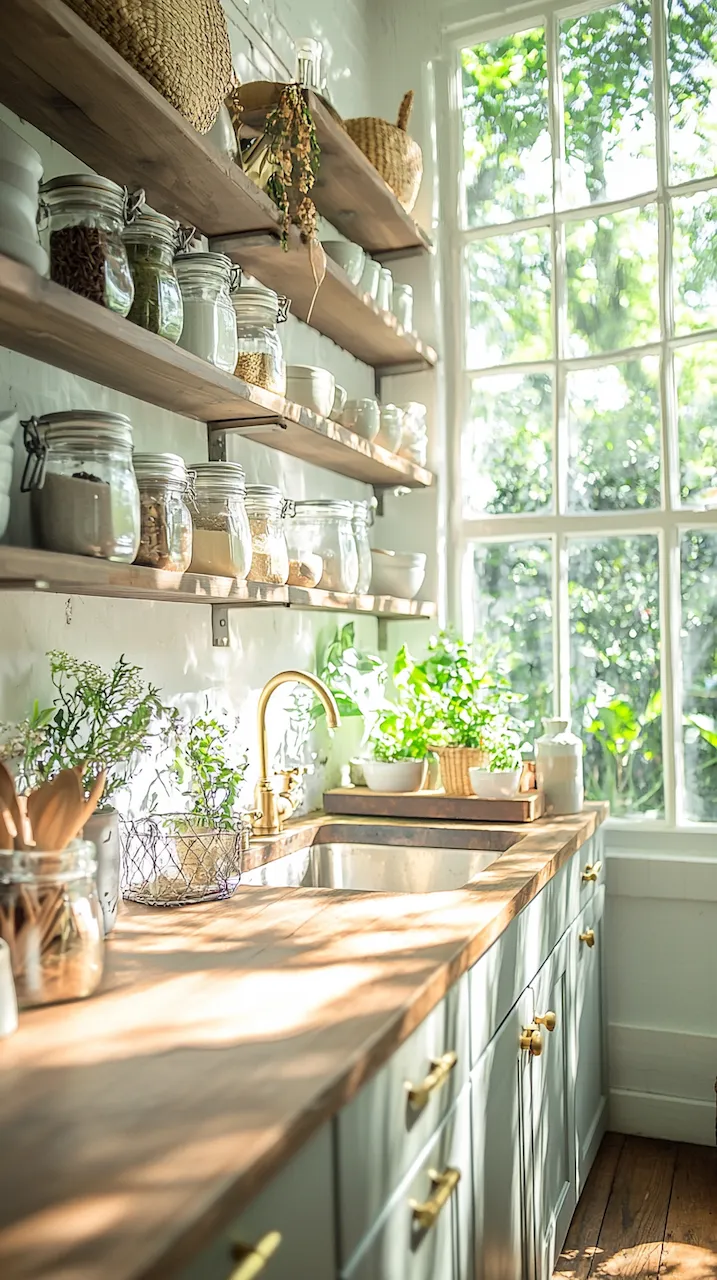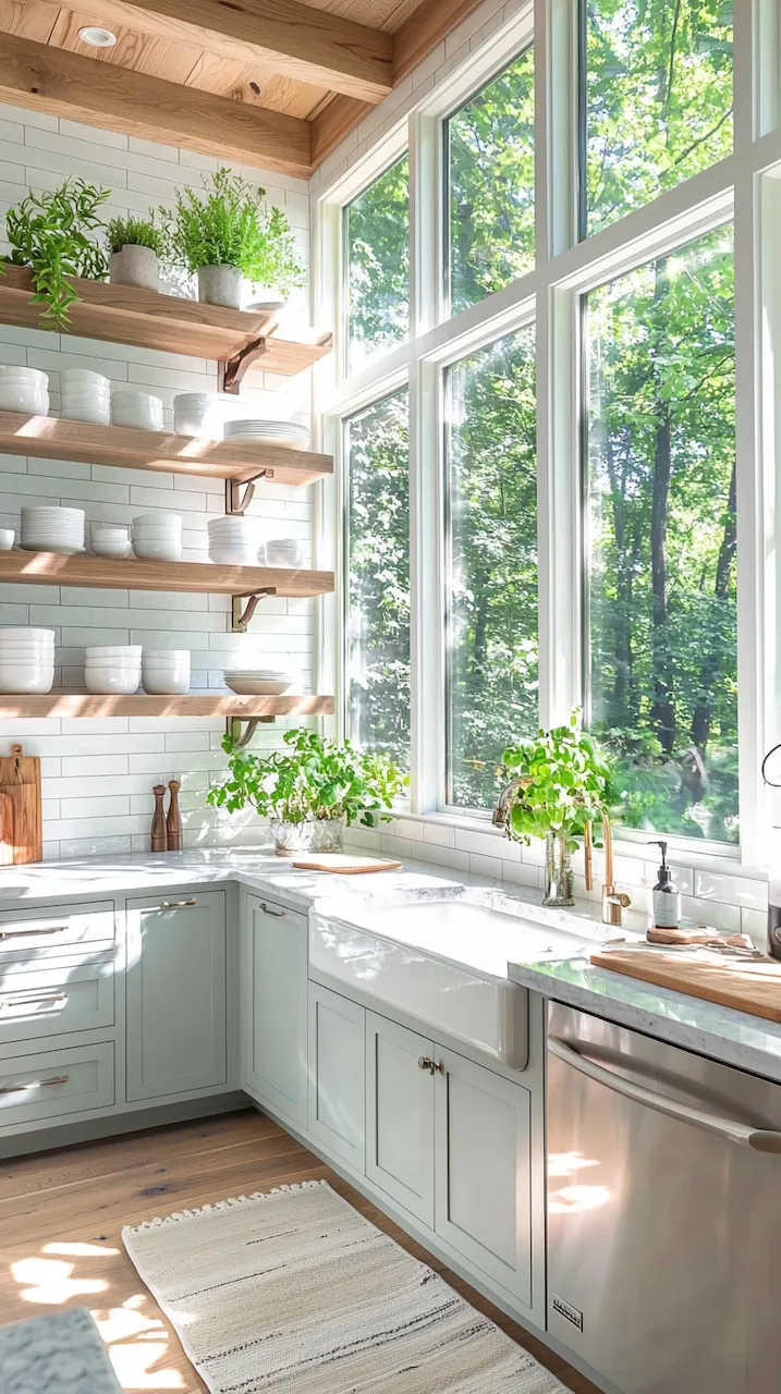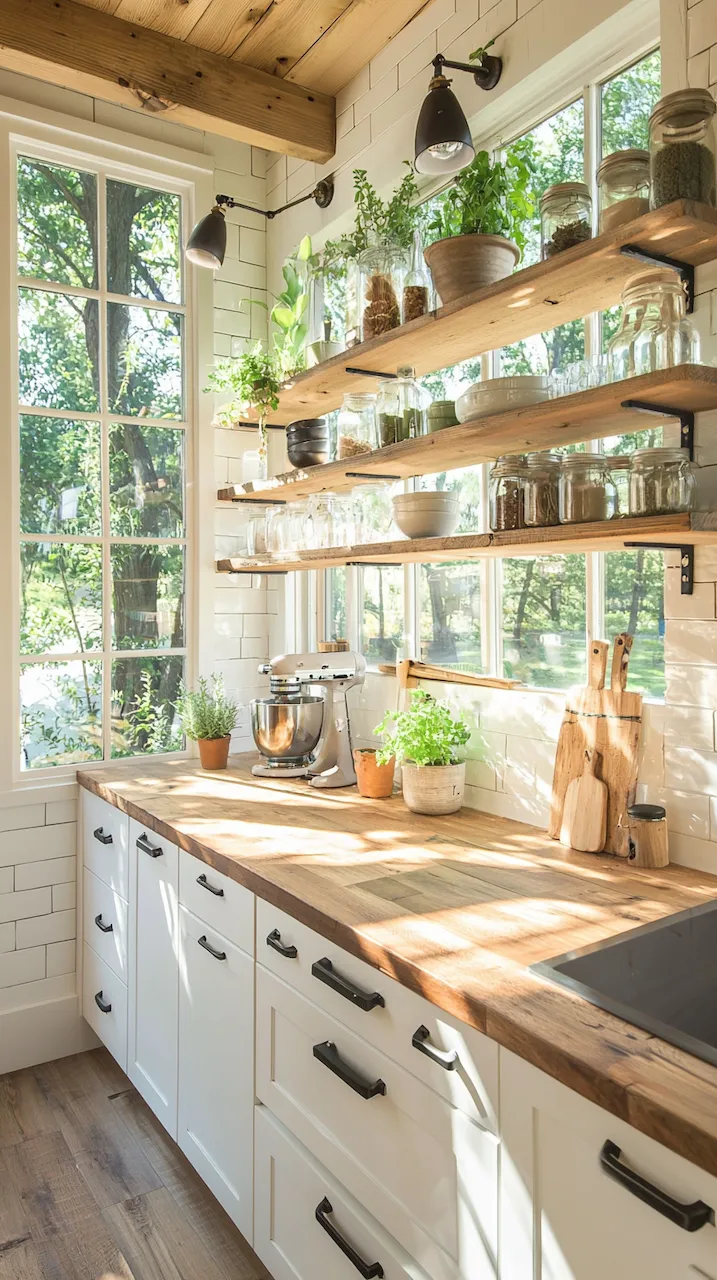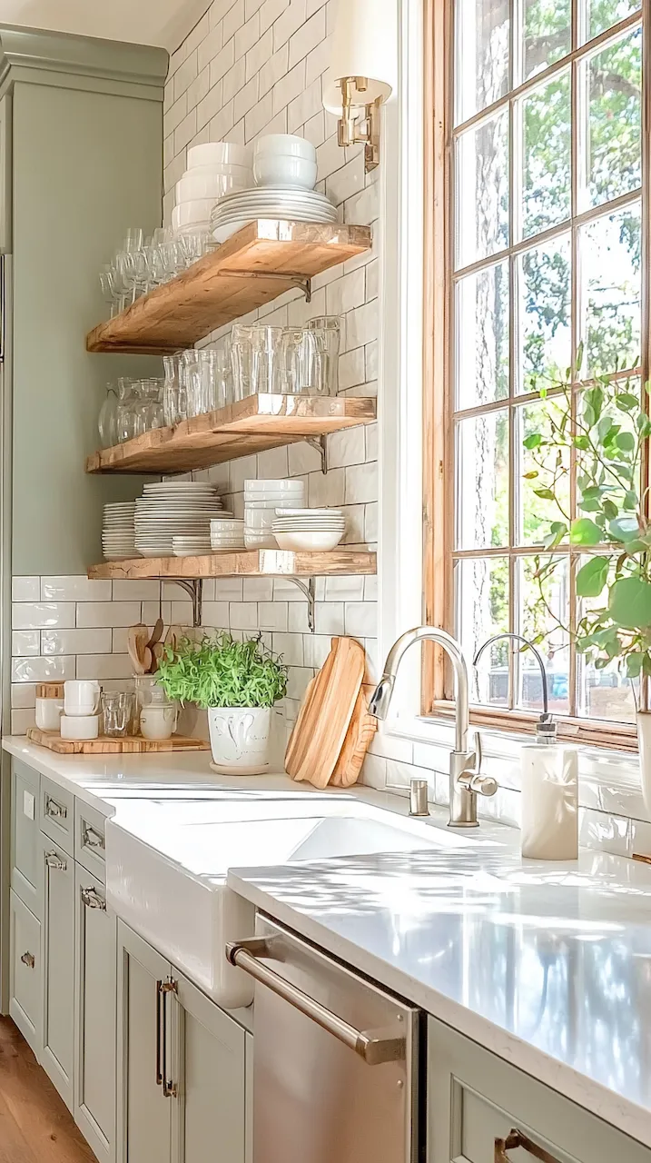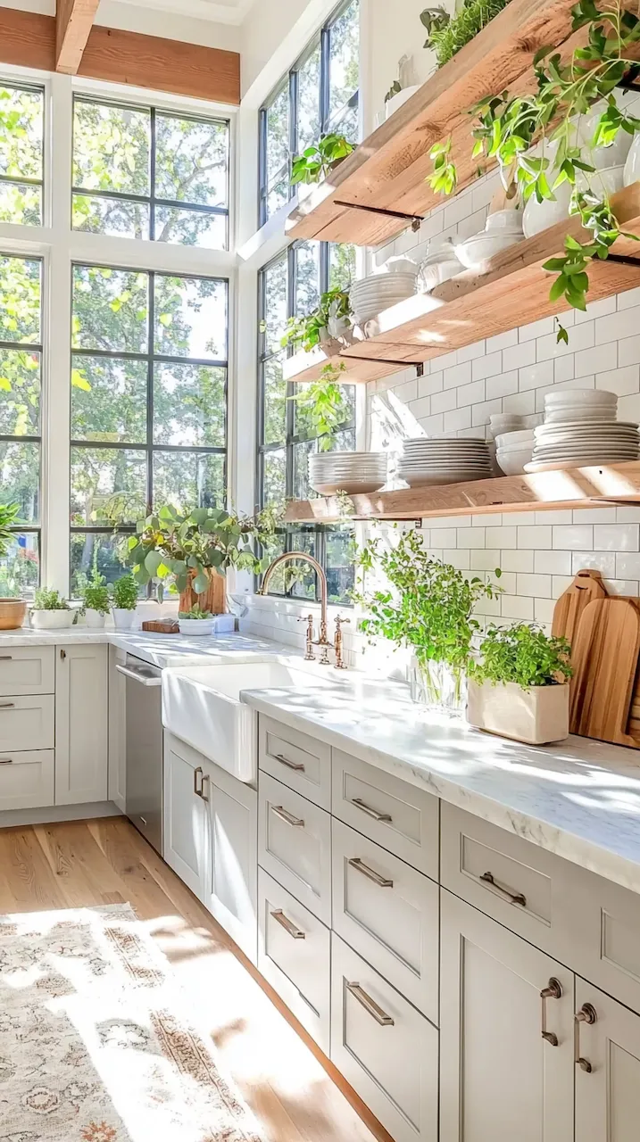 Built-in open shelving is another masterstroke where statement meets structure. A row of slim, steel-framed shelves installed above the countertop becomes a modernist sculpture as much as a practical storage solution. Whether displaying curated ceramics or a rotating cast of cookbooks and art objects, these shelves blur the boundary between utility and art. They create visual continuity with the rest of the home, especially when the kitchen opens up into a dining or living area—a common feature in cottage-style spaces.