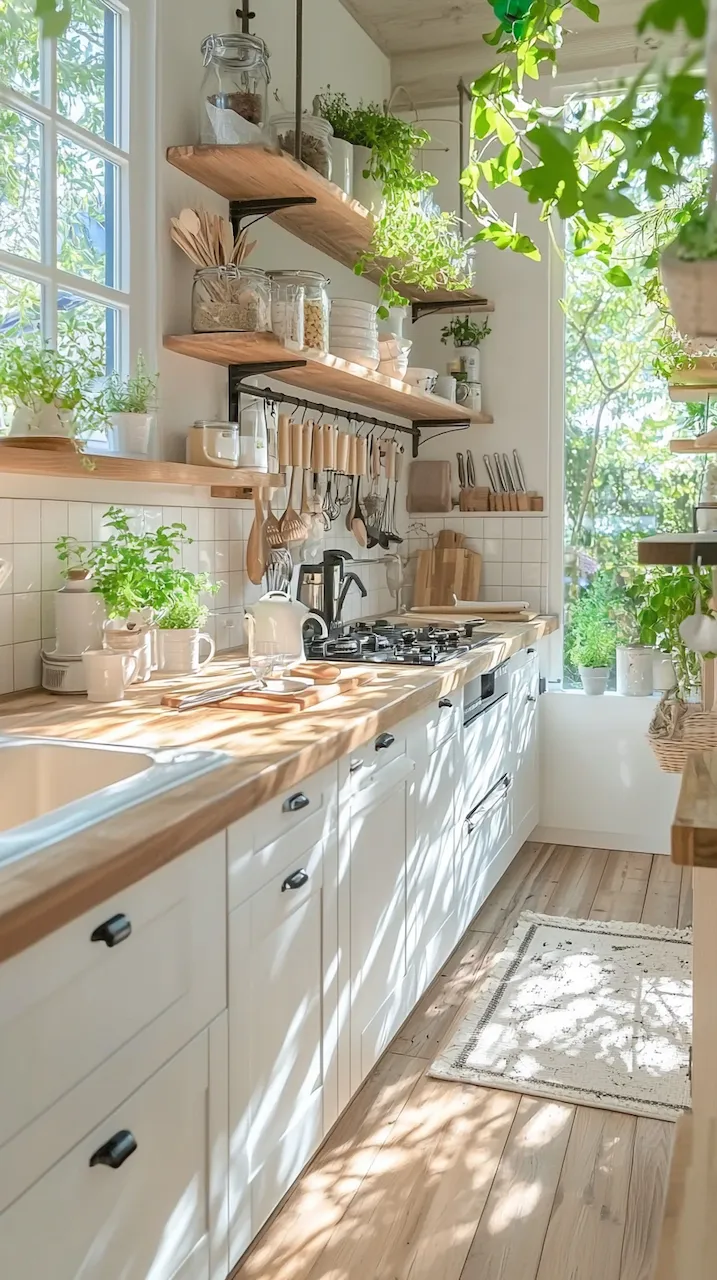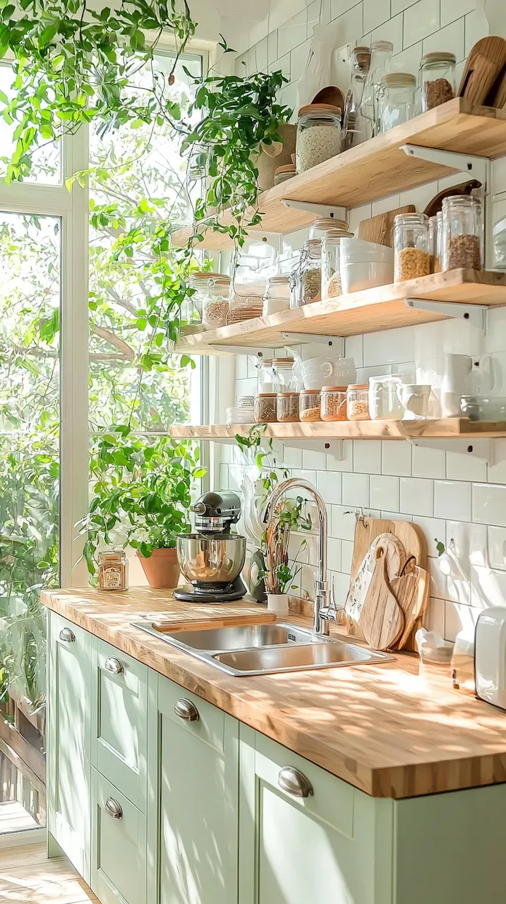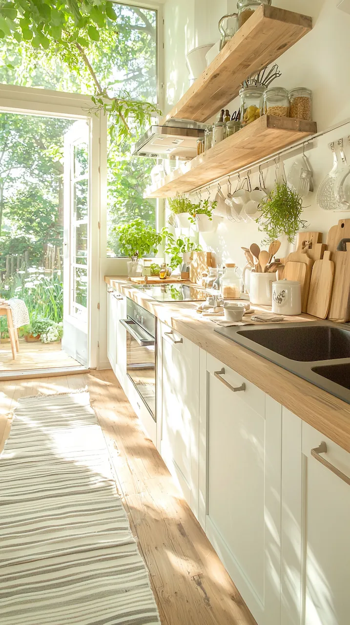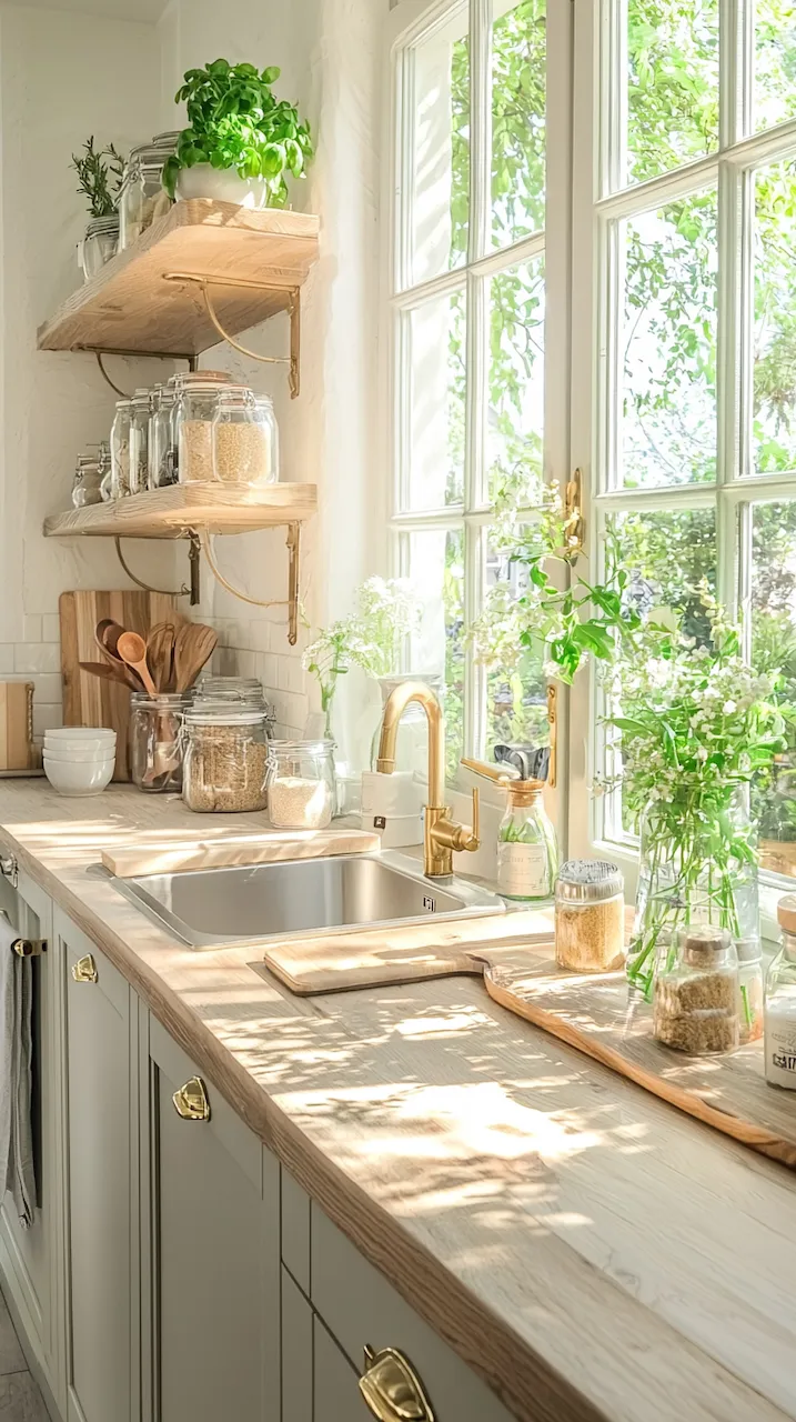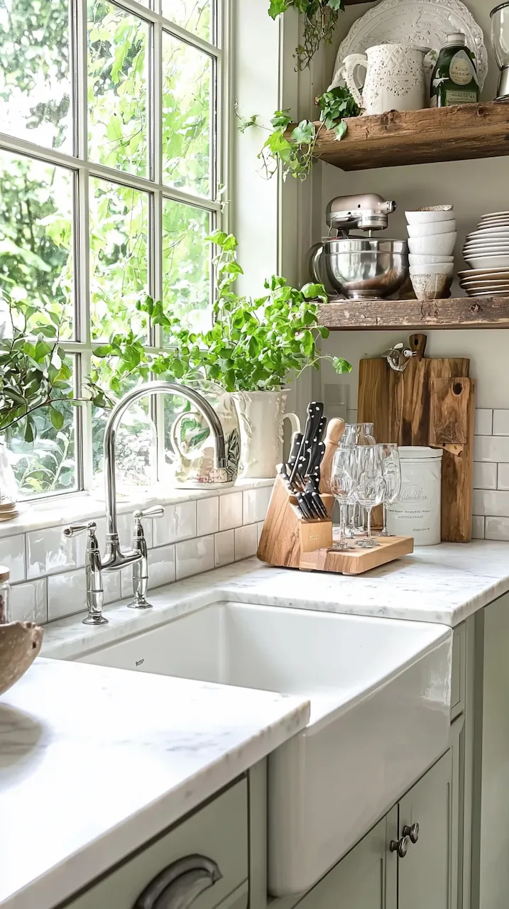 Built-in open shelving is another masterstroke where statement meets structure. A row of slim, steel-framed shelves installed above the countertop becomes a modernist sculpture as much as a practical storage solution. Whether displaying curated ceramics or a rotating cast of cookbooks and art objects, these shelves blur the boundary between utility and art. They create visual continuity with the rest of the home, especially when the kitchen opens up into a dining or living area—a common feature in cottage-style spaces.