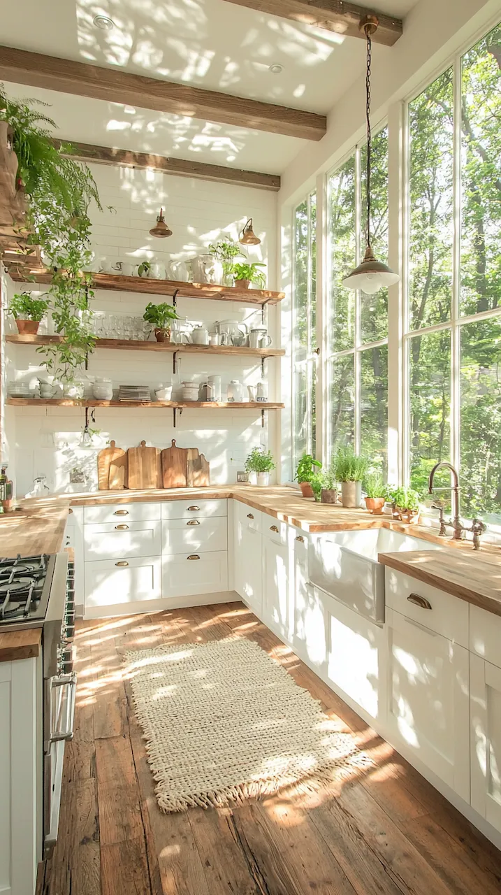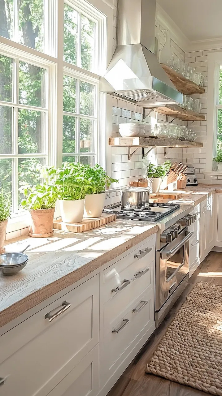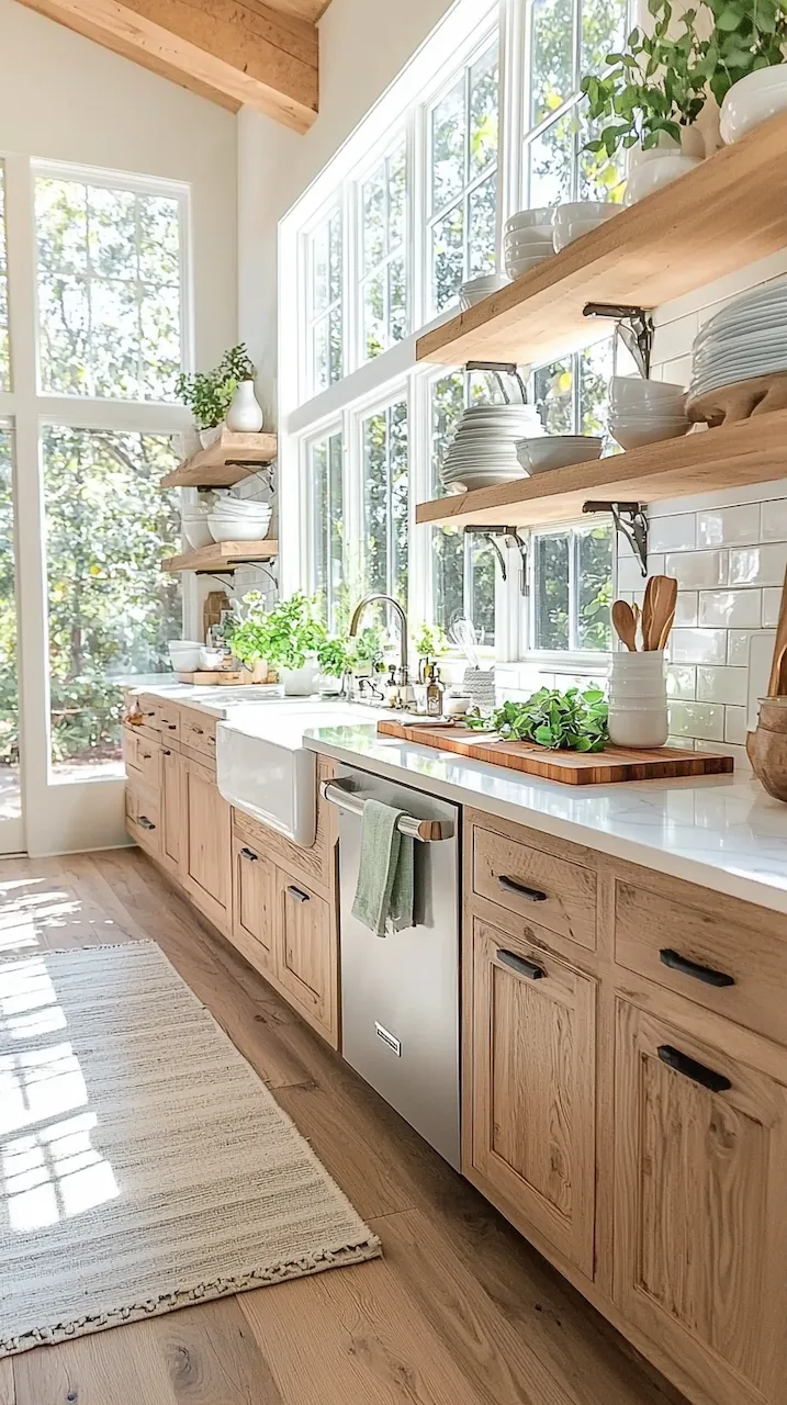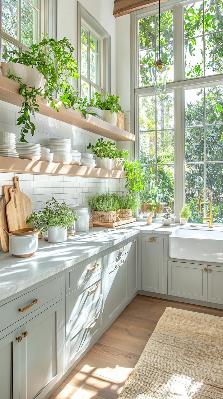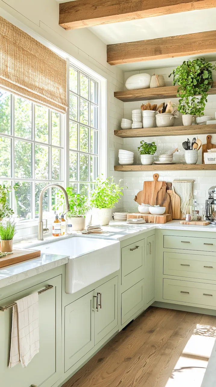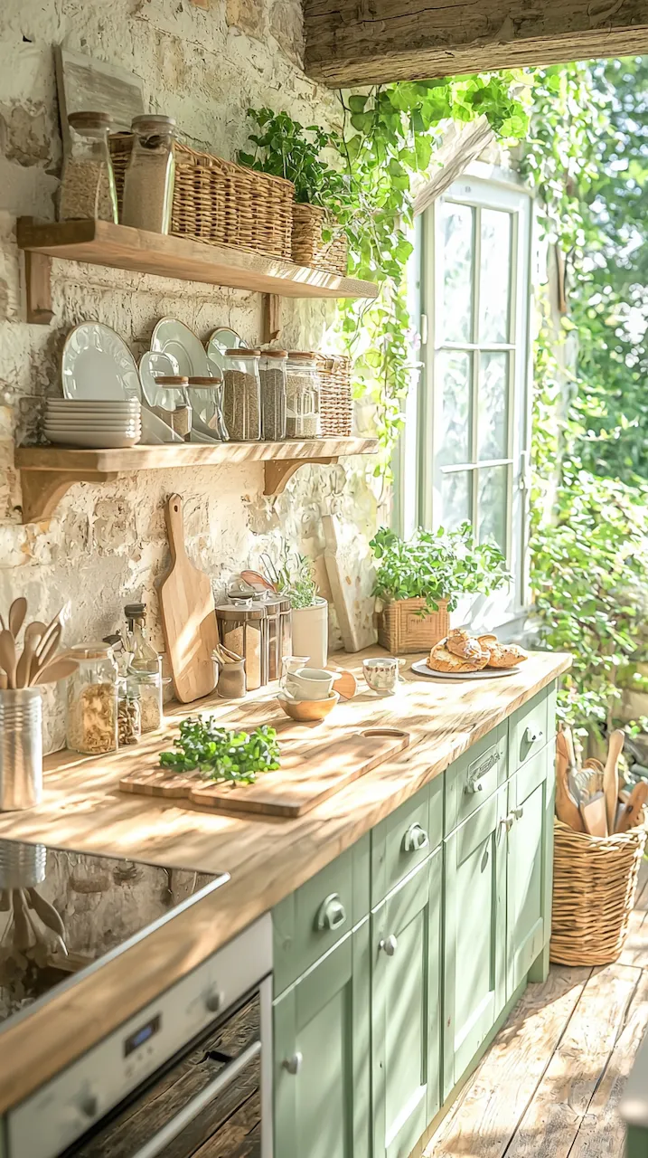Built-in open shelving is another masterstroke where statement meets structure. A row of slim, steel-framed shelves installed above the countertop becomes a modernist sculpture as much as a practical storage solution. Whether displaying curated ceramics or a rotating cast of cookbooks and art objects, these shelves blur the boundary between utility and art. They create visual continuity with the rest of the home, especially when the kitchen opens up into a dining or living area—a common feature in cottage-style spaces.